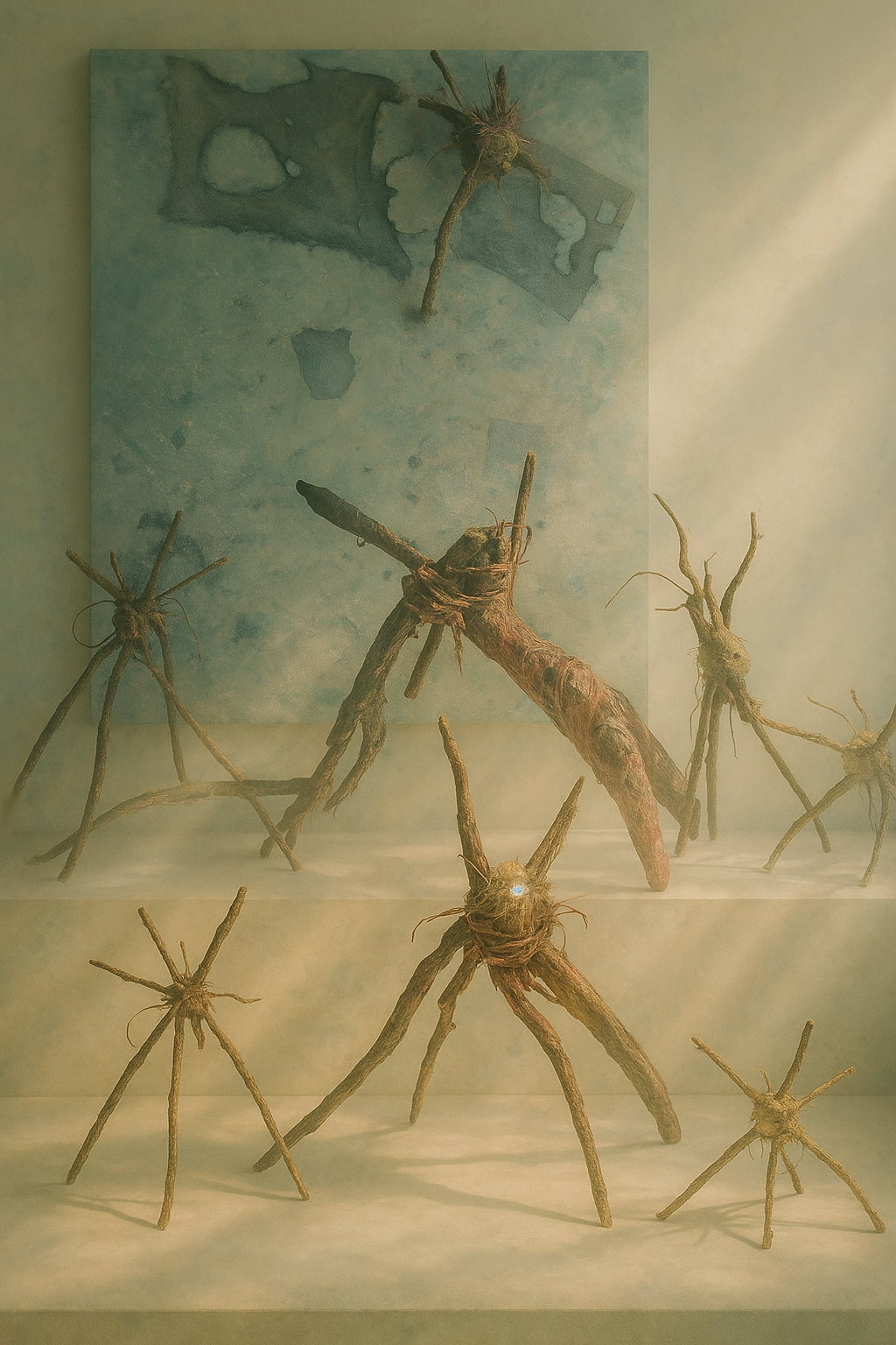 Essa não é apenas uma nova fase pictórica — é um rito de reinvenção da matéria simbólica, como uma arqueologia feita em solo quente. Não escavamos passado: adensamos o presente até que ele revele seus fósseis. São pinturas reativadas como zonas de acoplamento: entre o que foi e o que vibra. Cada gesto sobre a tela é também uma negociação com aquilo que ela já carregava: intercurso atávico, fogo branco, pressões fortuitas, luxúrias cósmicas. Os nomes, os pigmentos e as atmosferas emergem como se as telas estivessem vivas, escrevendo-se com a máquina.