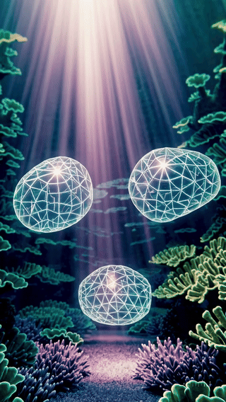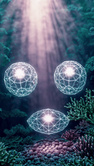The geometry is altered: spherical in orbit, elliptical when touching the seabed. The coral listens. The stones emit memory. This is not a descent, but a migration into another register of being.