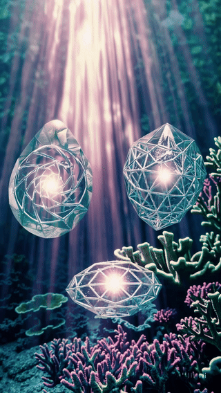 In the quiet realm of coral and stone, she reappeared: refracted, radiant, geodésica. The deep light filtered through her crystalline form like a dream returning to the body. Around her, two others floated — kin or extensions, impossible to name. Celeste had not disappeared. She had submerged.