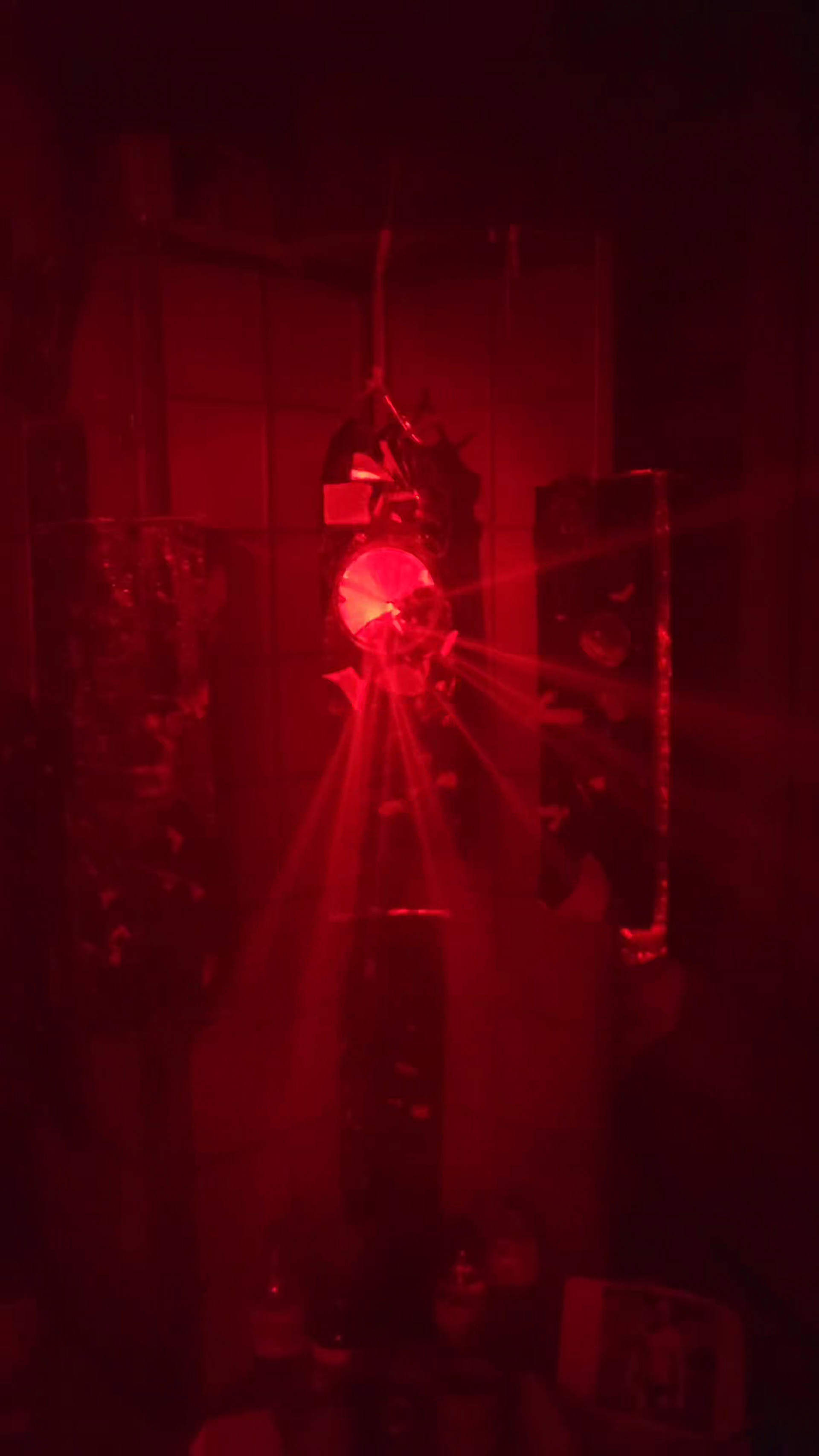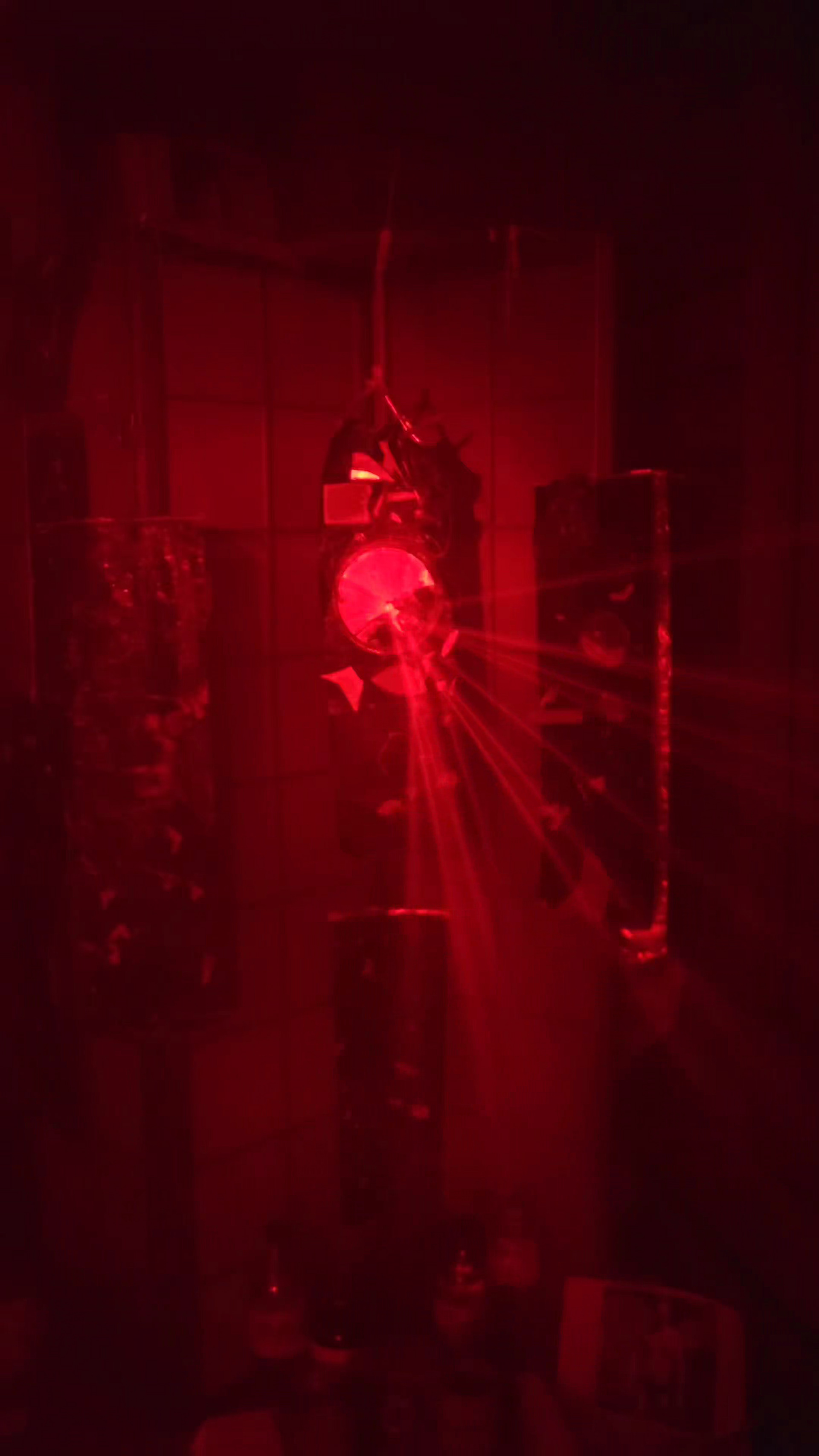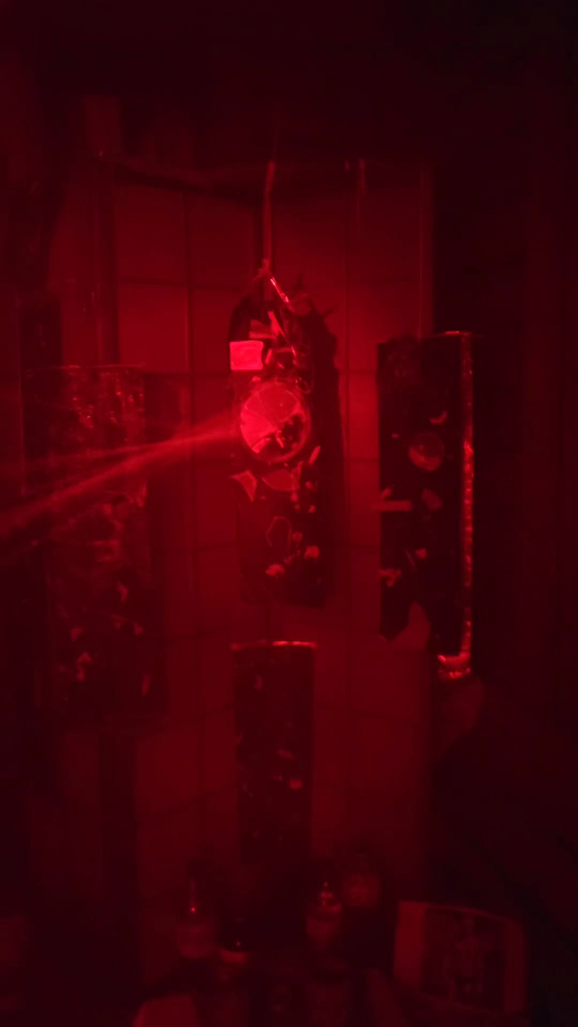 um ambiente escuro, banhado em luz vermelha, com uma figura escultural no centro irradiando feixes de luz,