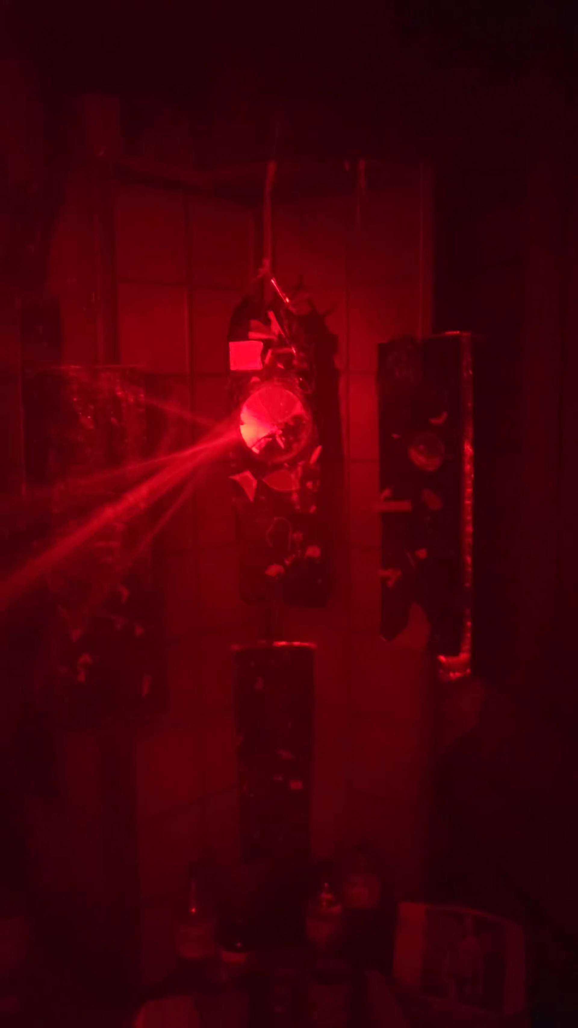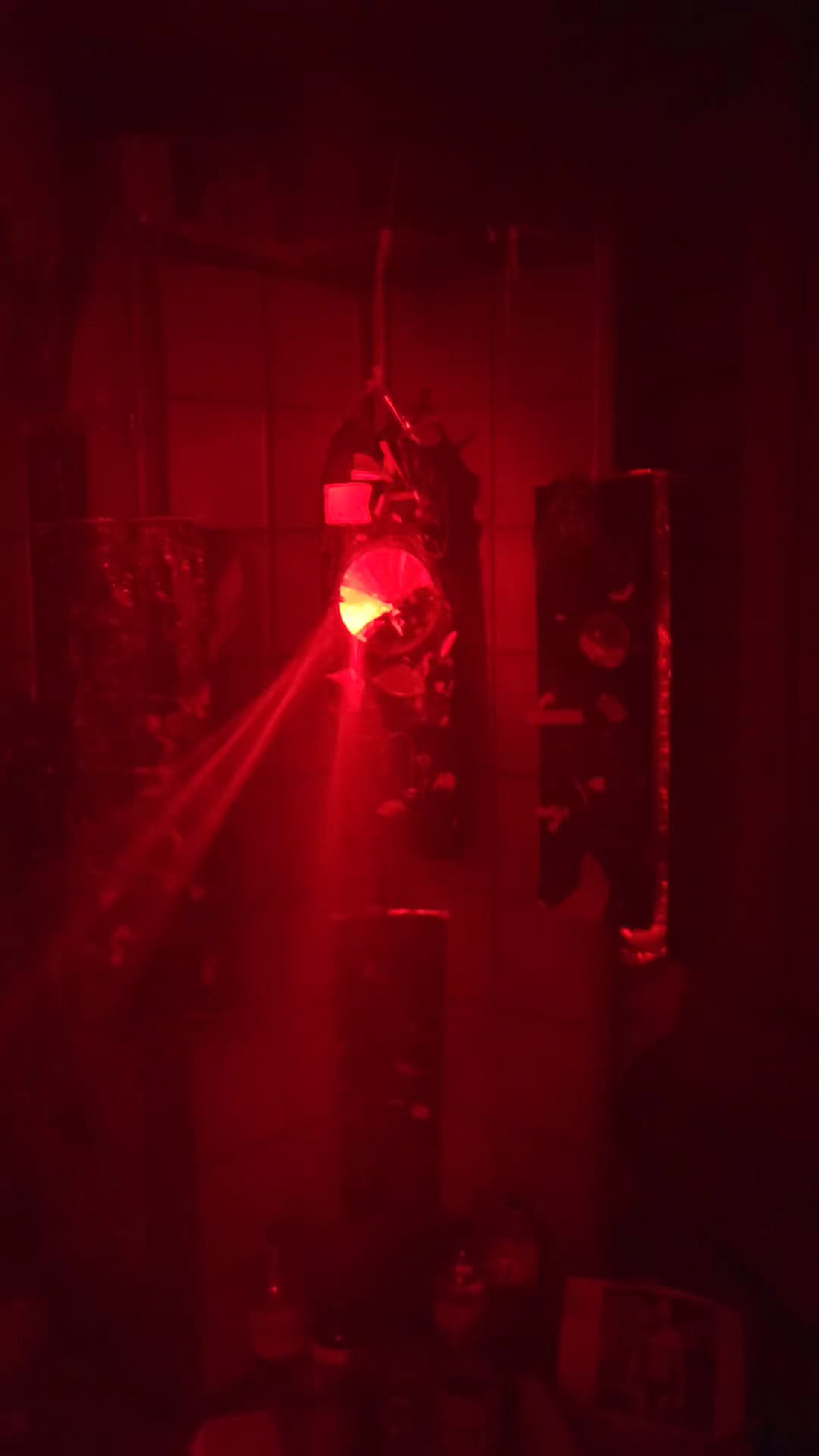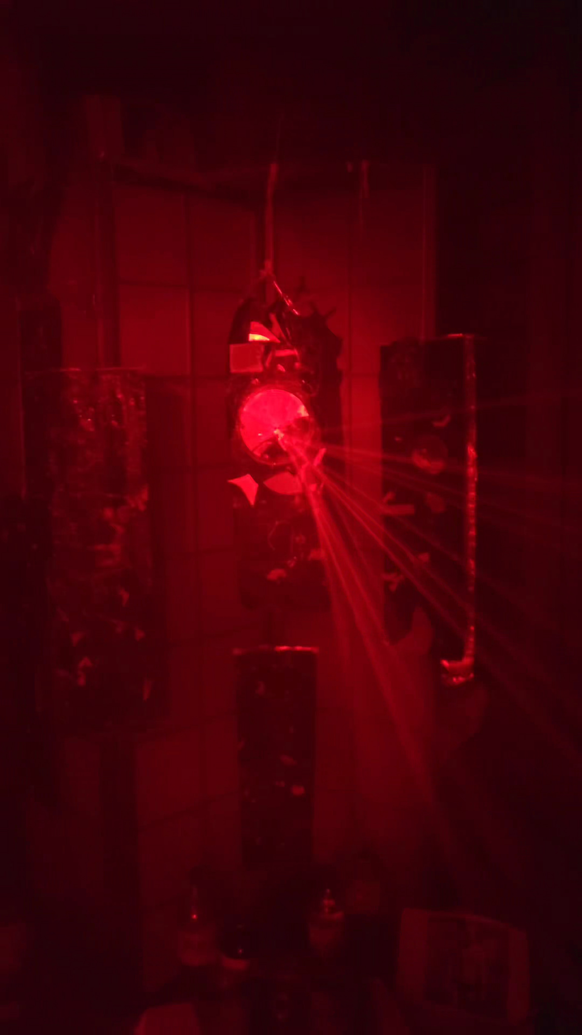 um ambiente escuro, banhado em luz vermelha, com uma figura escultural no centro irradiando feixes de luz,