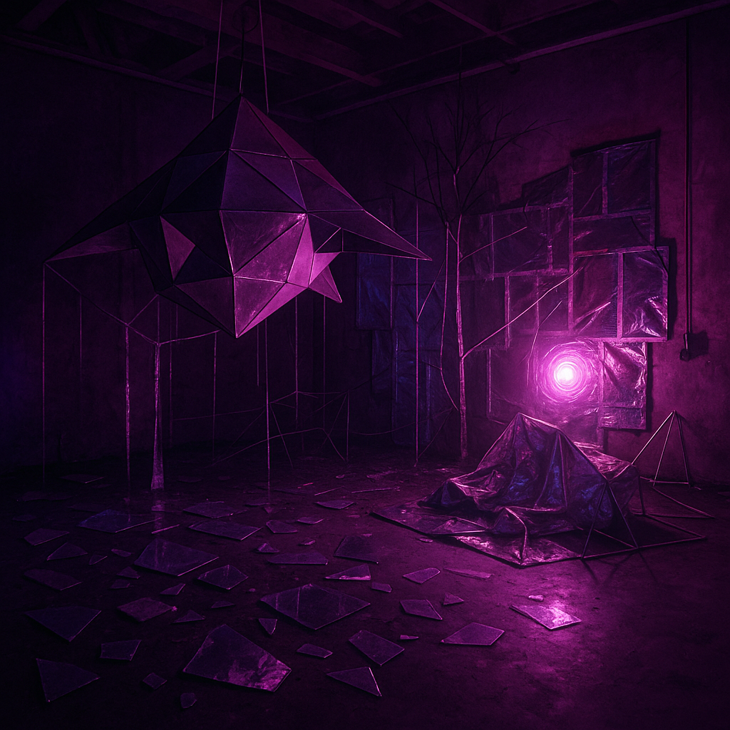 reflexo no disco espelhado se desdobra como um yantra ativo, disparando feixes de consciência.