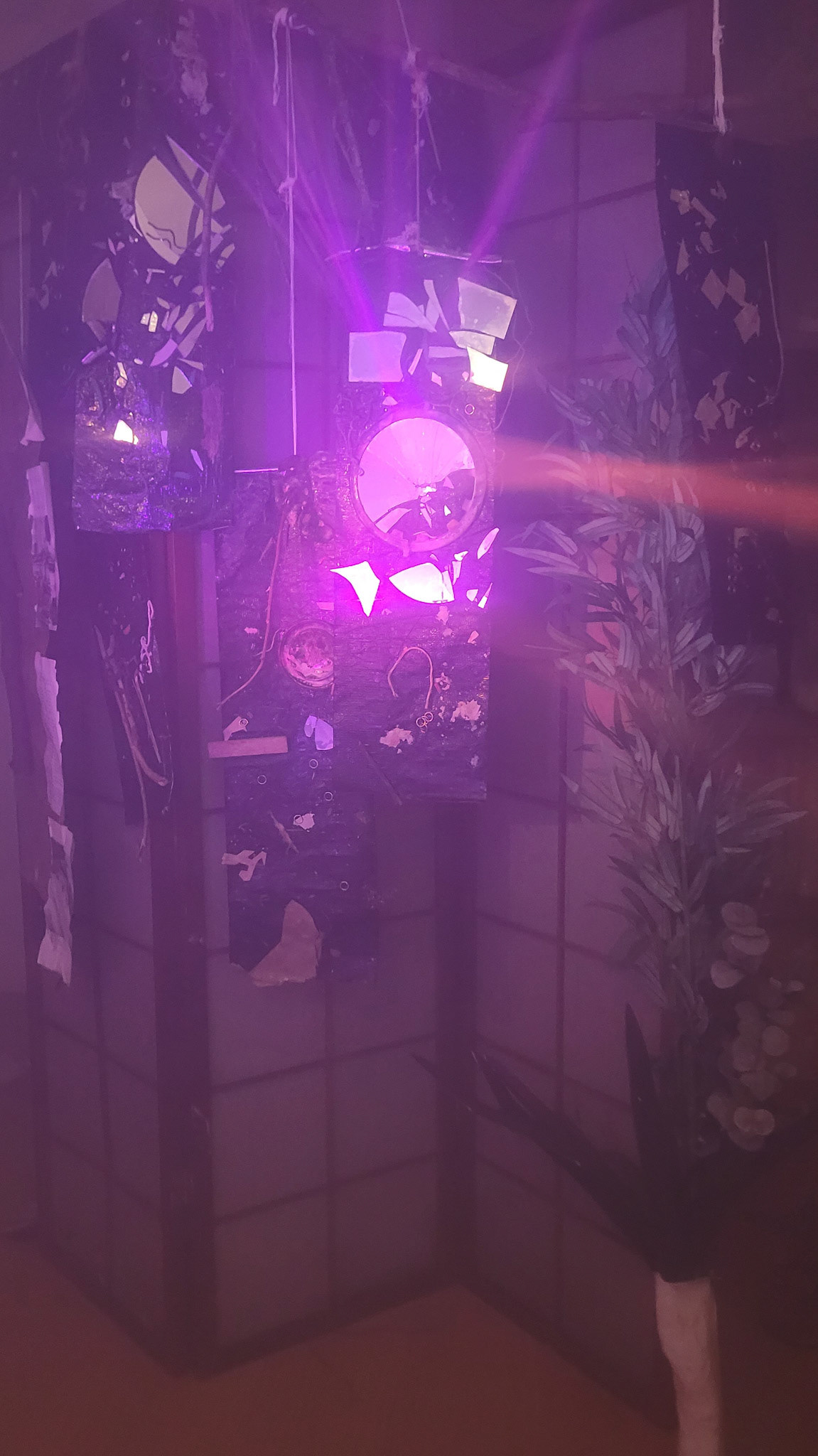 acoplada a uma escultura-altar (talvez até feita com resíduos tecnológicos e elementos naturais), emitindo fragmentos narrativos, lendas inventadas, poemas ancestrais do futuro.