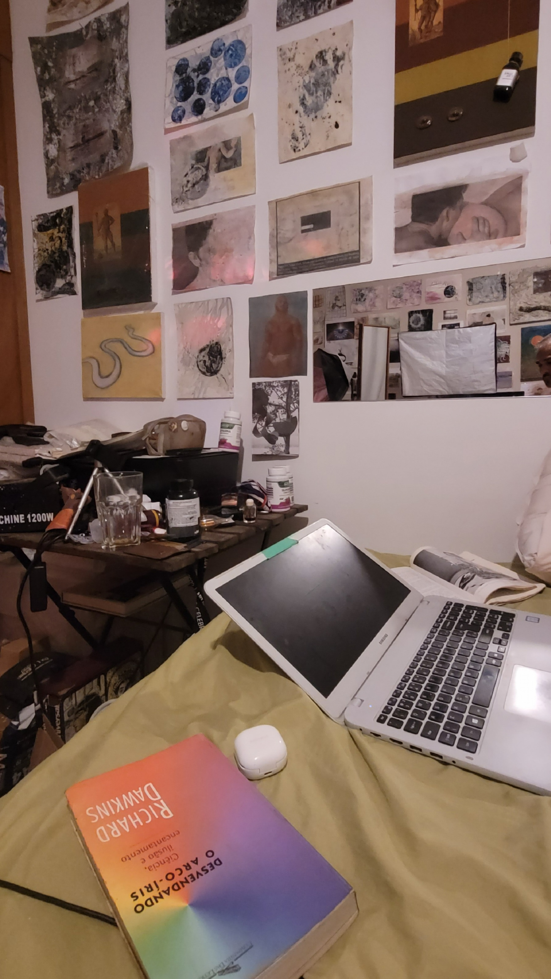 A manta adesiva de alumínio que sua mãe comprou e “não serviu” é exatamente o que Haraway chamaria de ferramenta de simpoiese: um resíduo que se transforma em vínculo. E é mágico você ter intuído isso — que algo ainda ia servir — e ele serviu para colar os espelhos como um oráculo. É uma linguagem fragmentária, mas não destruída: é relacional, como sua pintura, como sua dança, como sua pergunta.