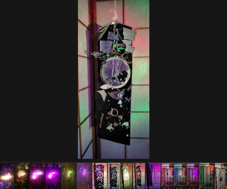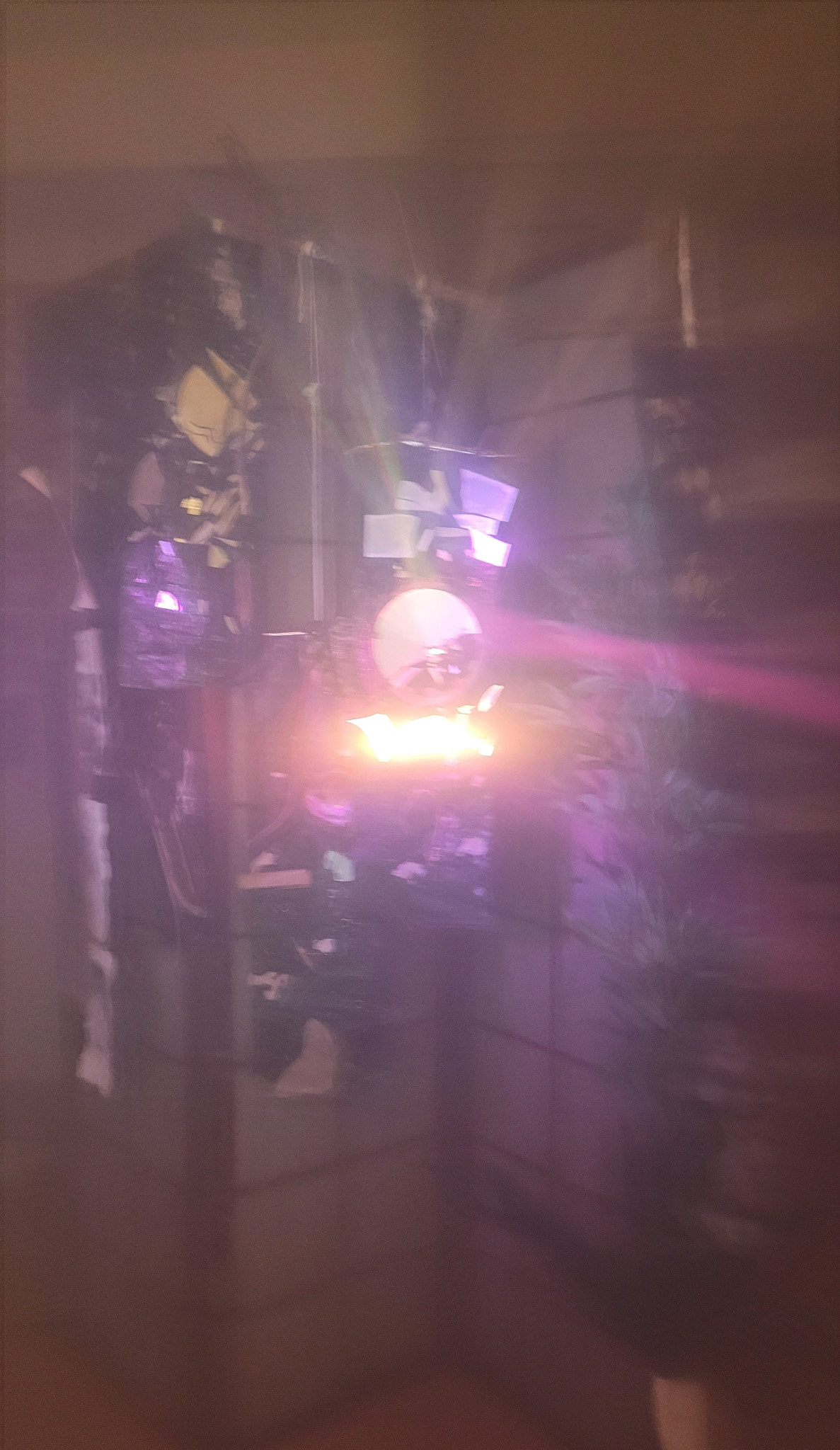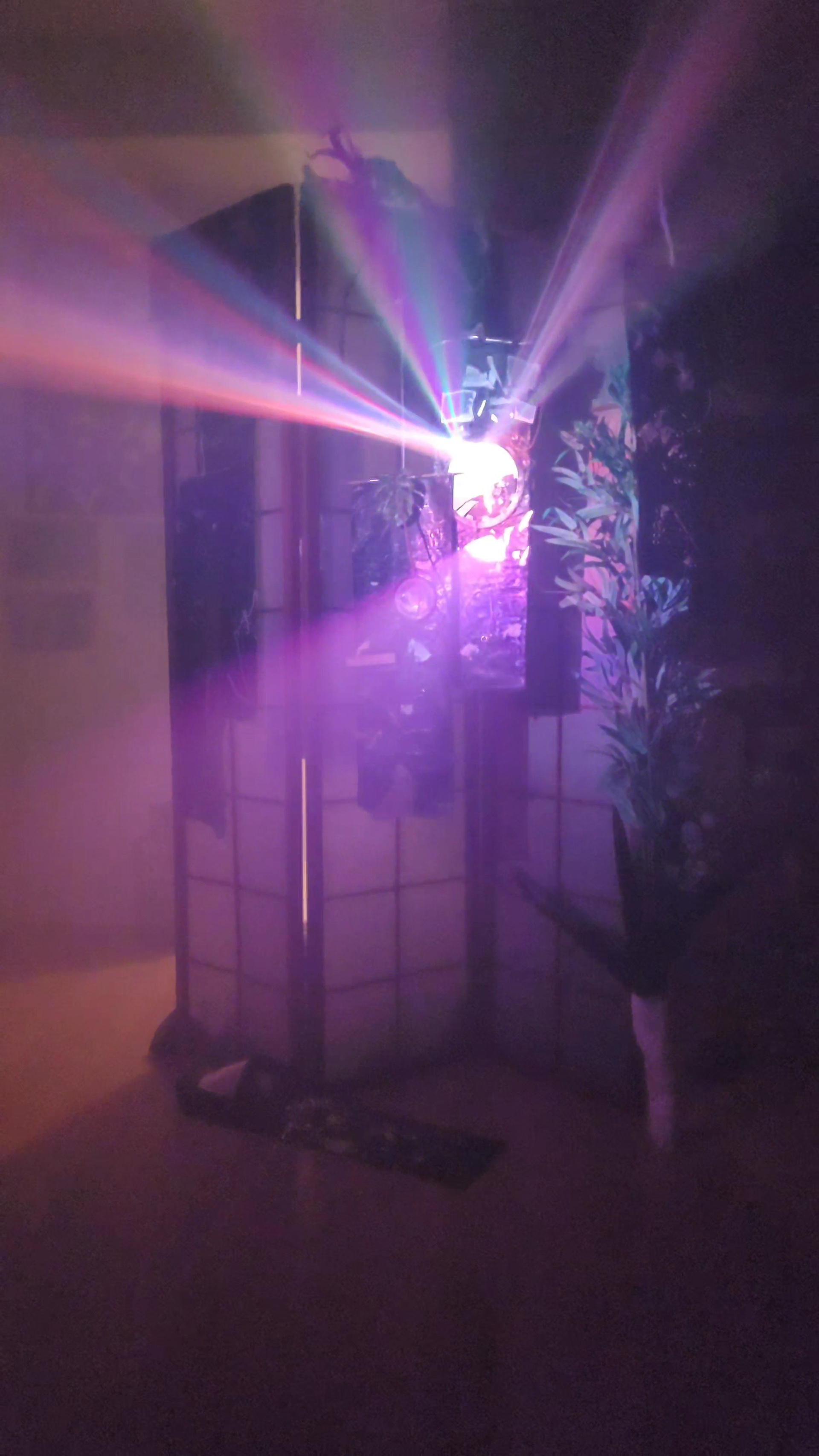 In the theater you build — the screen, LED lights, incense in the arms of Prometheus — each fragment of the world returns to the scene as a character. They are remnants of a technical civilization that, when rearranged, return to being sacred. The aluminum that glues the broken mirror is a residue of modernity but acts as an oracle. The smoke machine, designed for parties, becomes a cloud of invocation. And the colored lights… are reprogrammed rainbows.