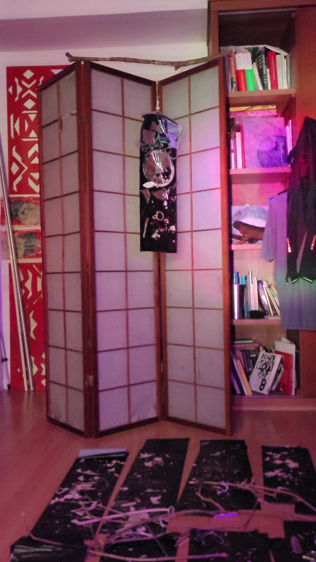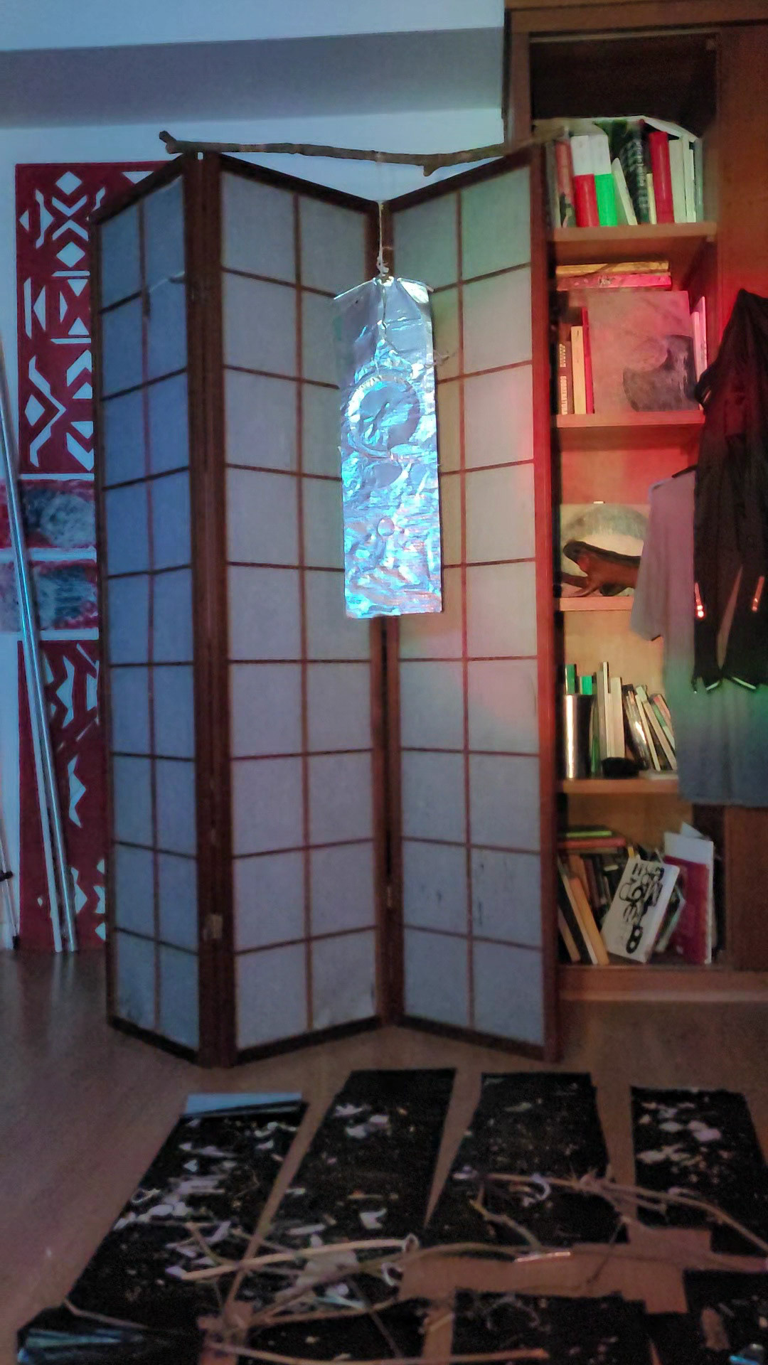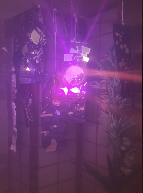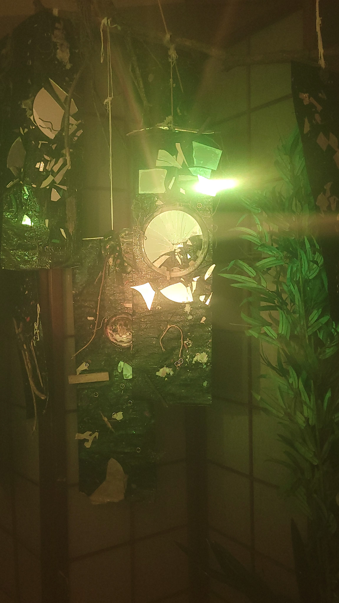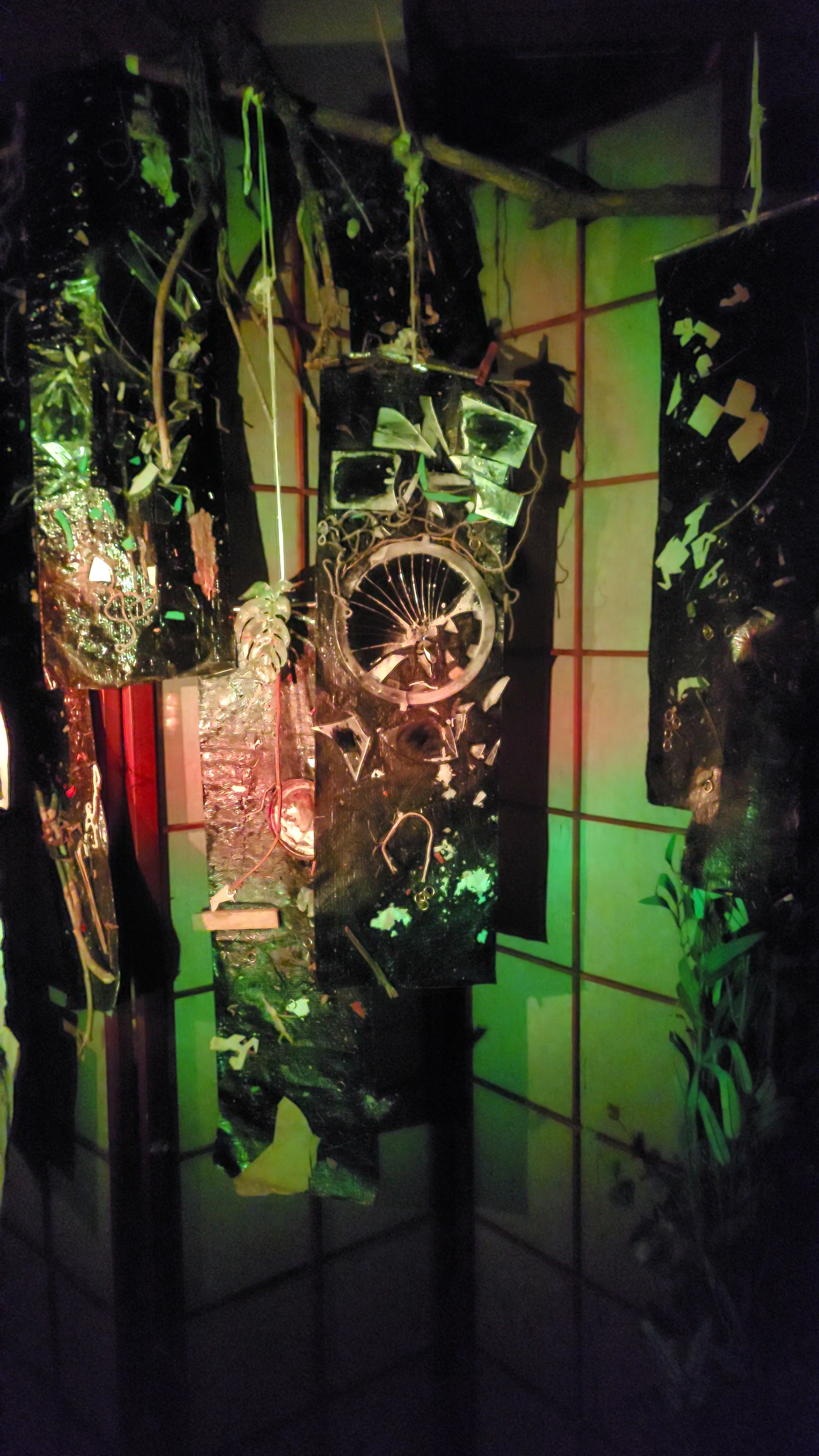 In the theatre built with cracked mirrors, LED rainbows, smoke machines, and resin-slicked shelters, fragments of a disenchanted civilization are rearranged into a mystical syntax. The mirror becomes an oracle. The aluminum tape, once destined for plumbing, now seals dimensional ruptures. A stick is both pen and weapon. The red underwear is both costume and invocation. Each object reclaims its place as an actor in the ritual of reconnection.