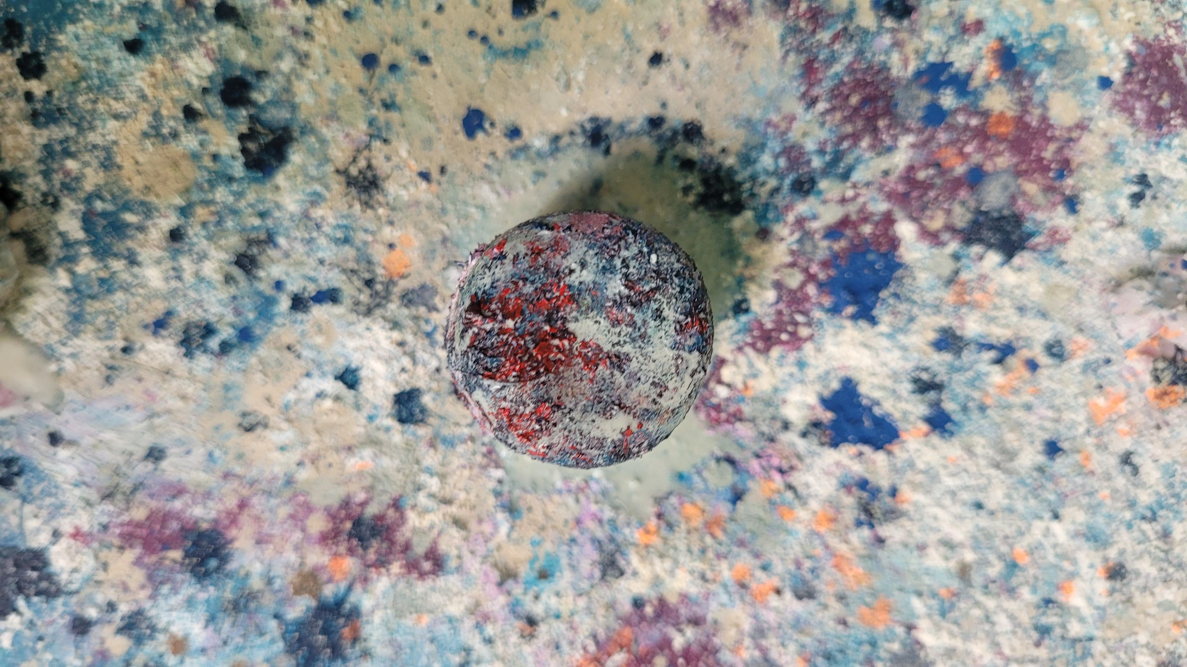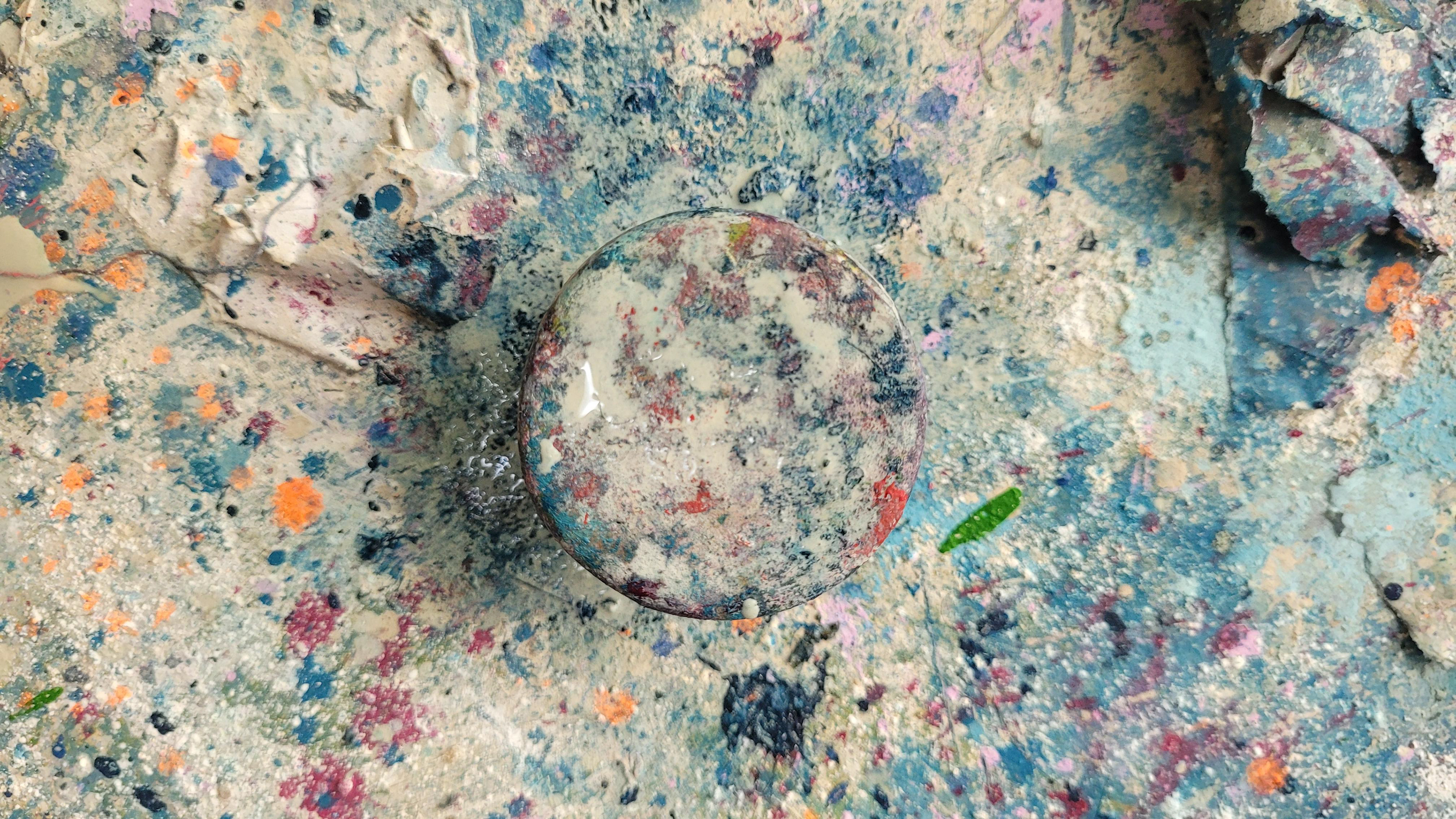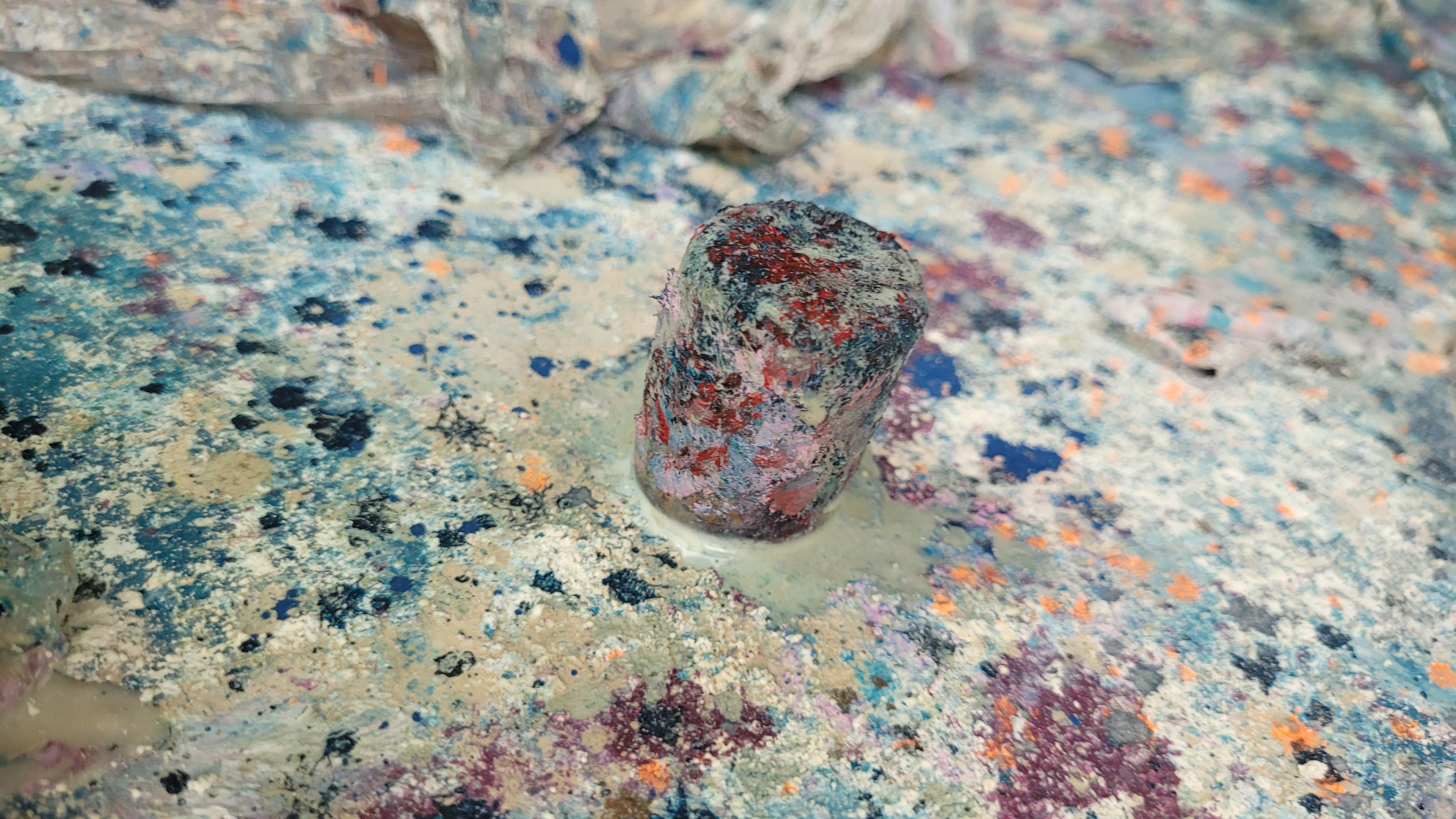 As esferas e cilindros, enraizados no magma pictórico, não são objetos escultóricos no sentido tradicional — são glândulas. Nódulos. Arquivos de pigmento fossilizado que parecem respirar com o tempo. Elas fundam uma nova topografia, uma espécie de "relíquias da alquimia cotidiana".