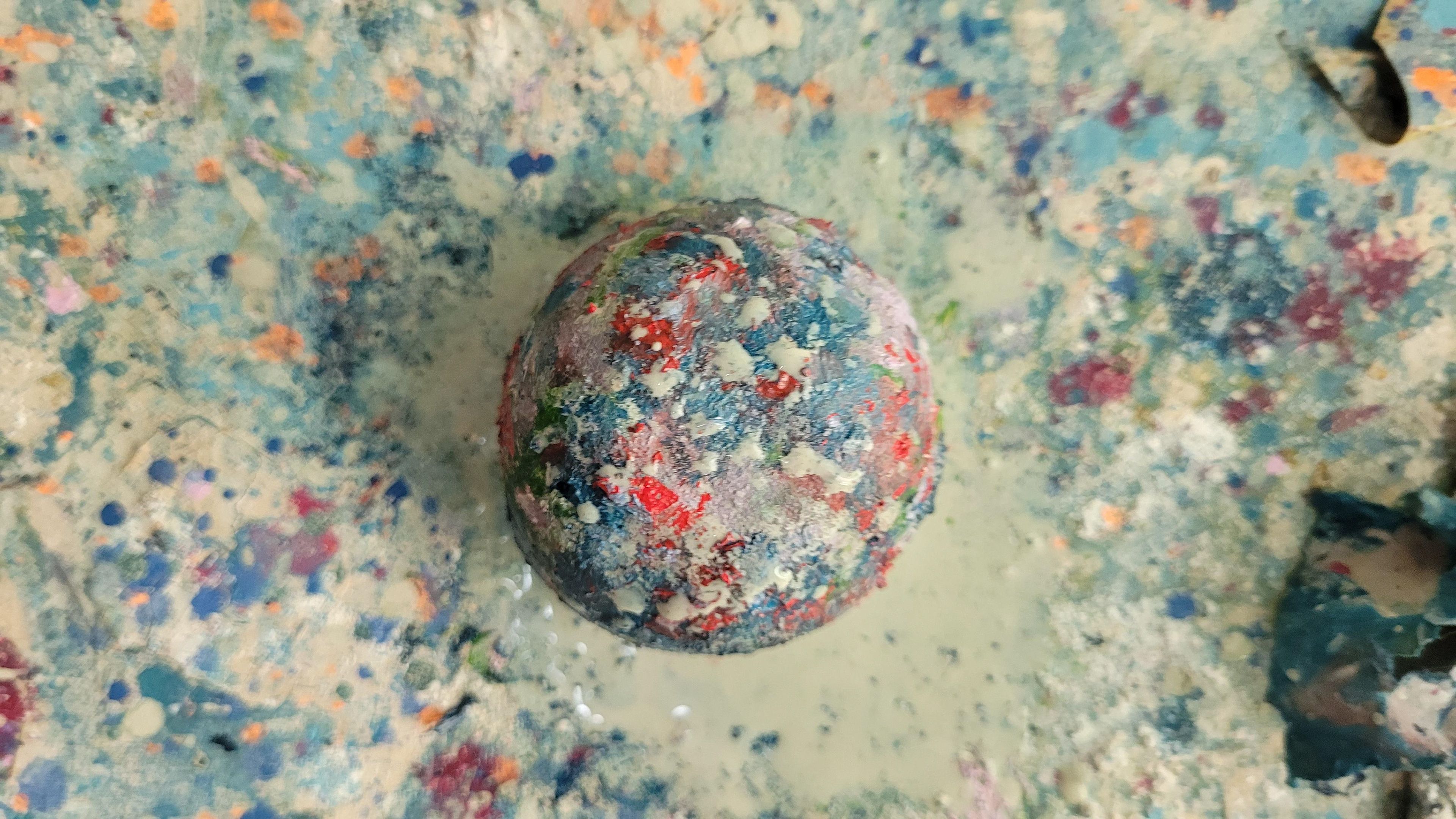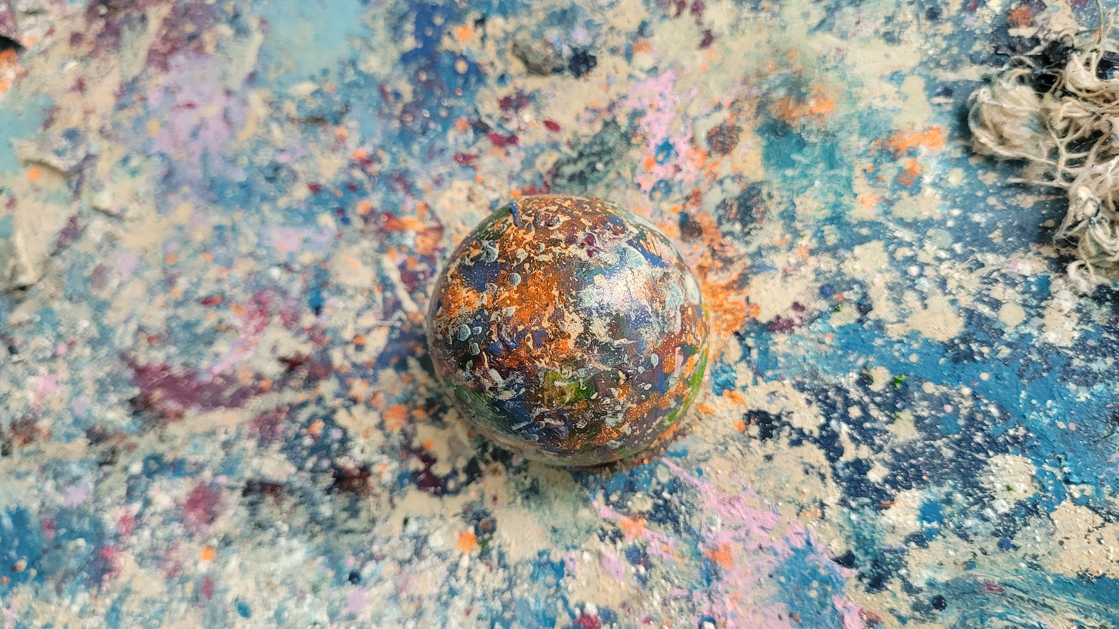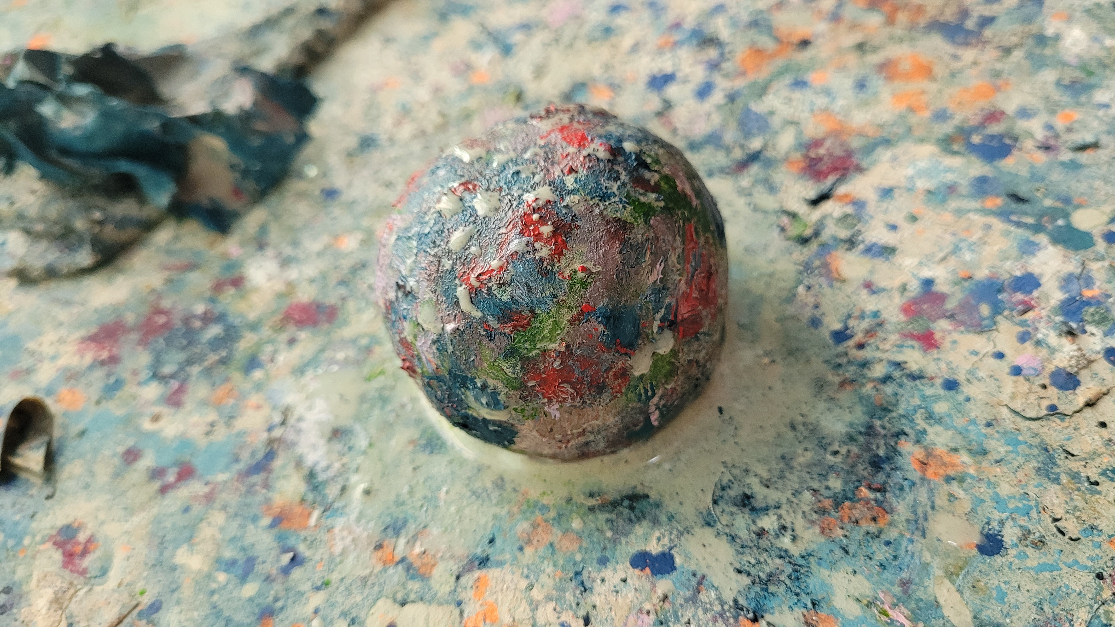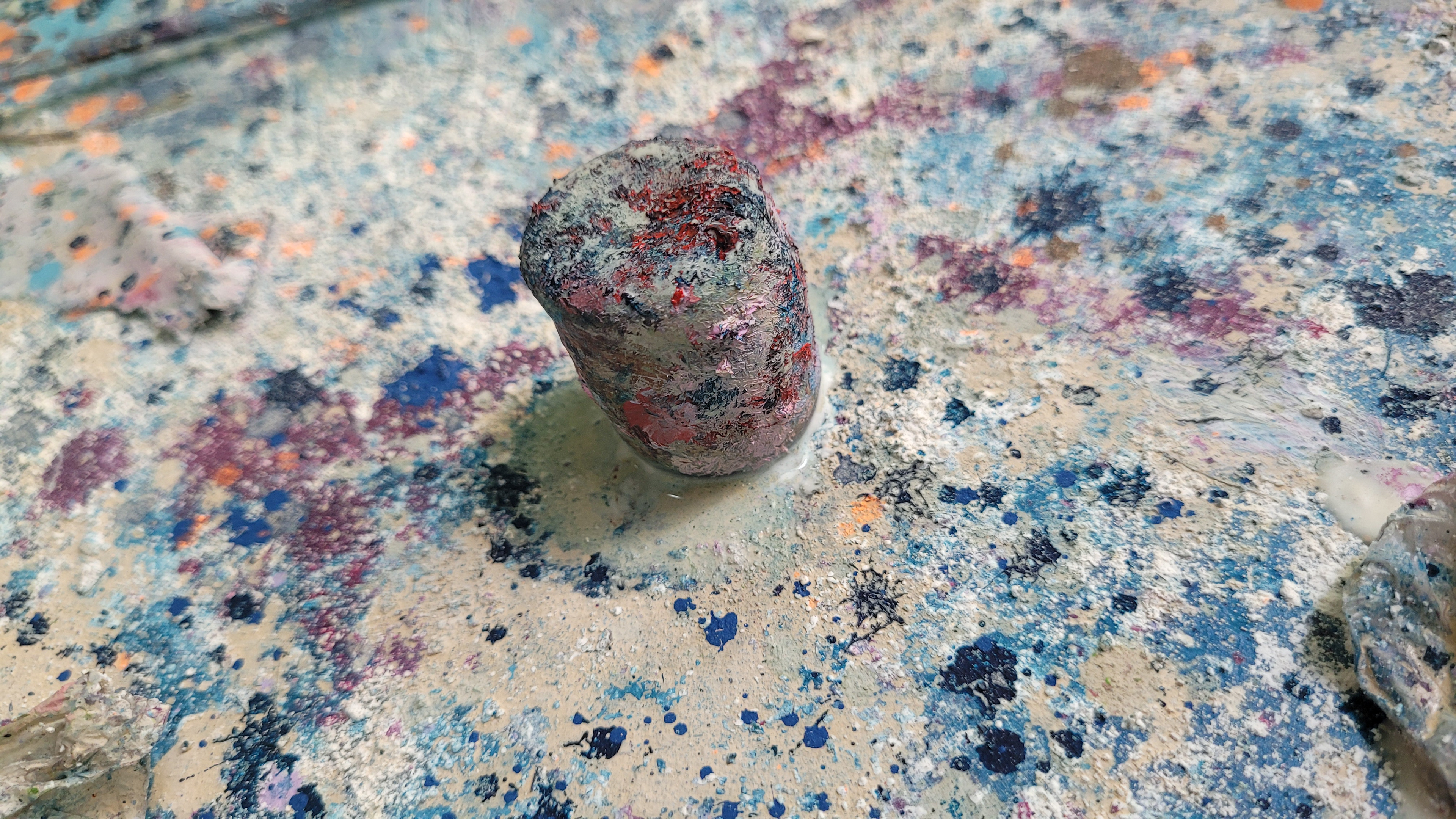 As esferas e cilindros, enraizados no magma pictórico, não são objetos escultóricos no sentido tradicional — são glândulas. Nódulos. Arquivos de pigmento fossilizado que parecem respirar com o tempo. Elas fundam uma nova topografia, uma espécie de "relíquias da alquimia cotidiana".