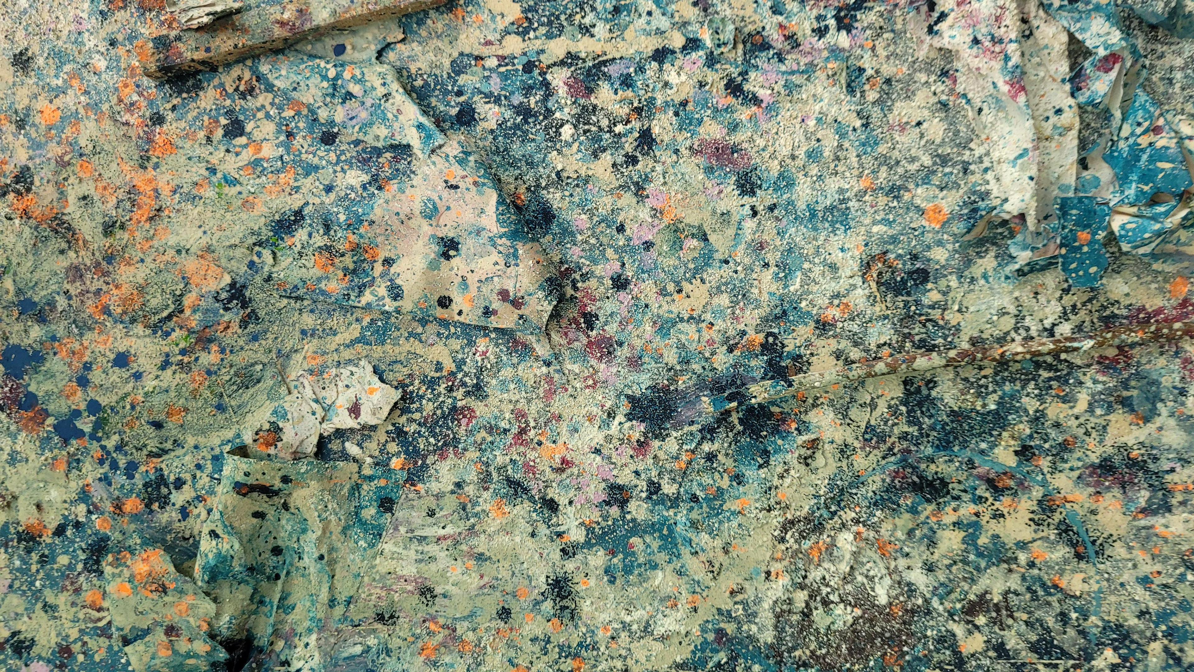 Há uma coreografia vibrátil entre os pontos laranja-anêmona e as zonas onde o silêncio se condensa em cal — não como ausência, mas como silêncio espesso, ancestral, abissal. A composição pulsa entre efervescência e erosão.