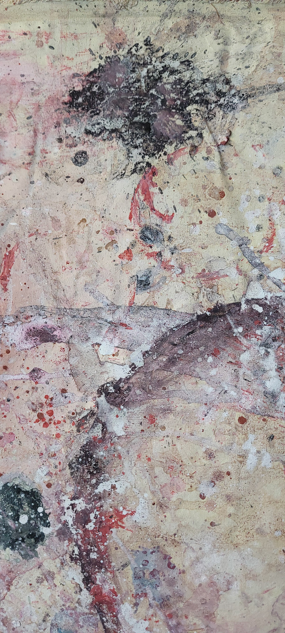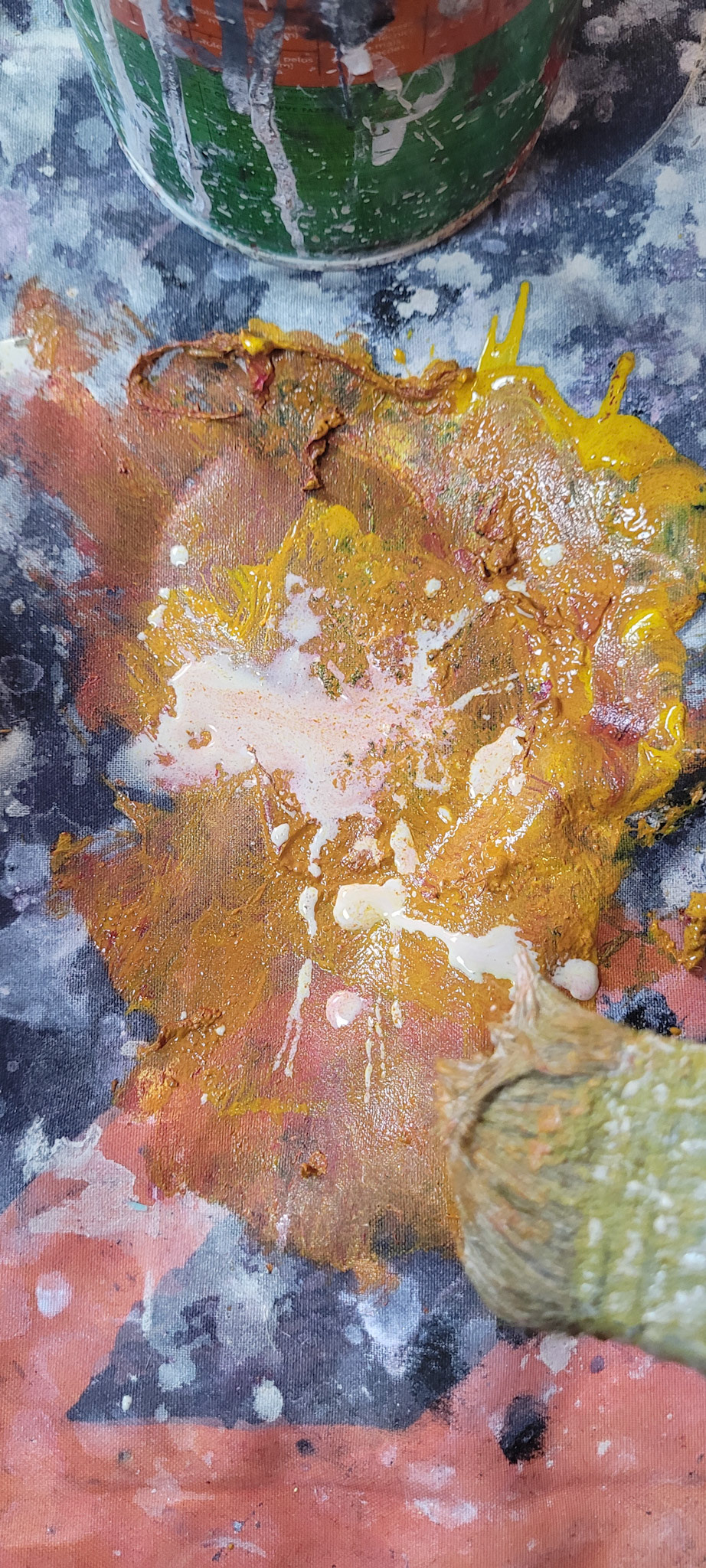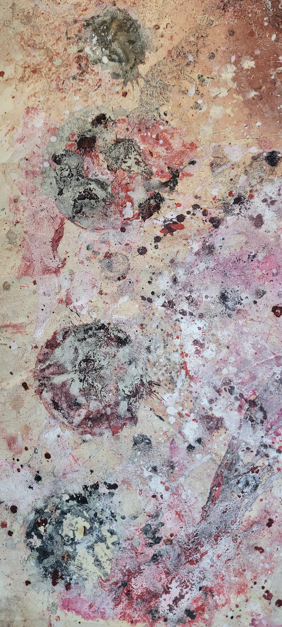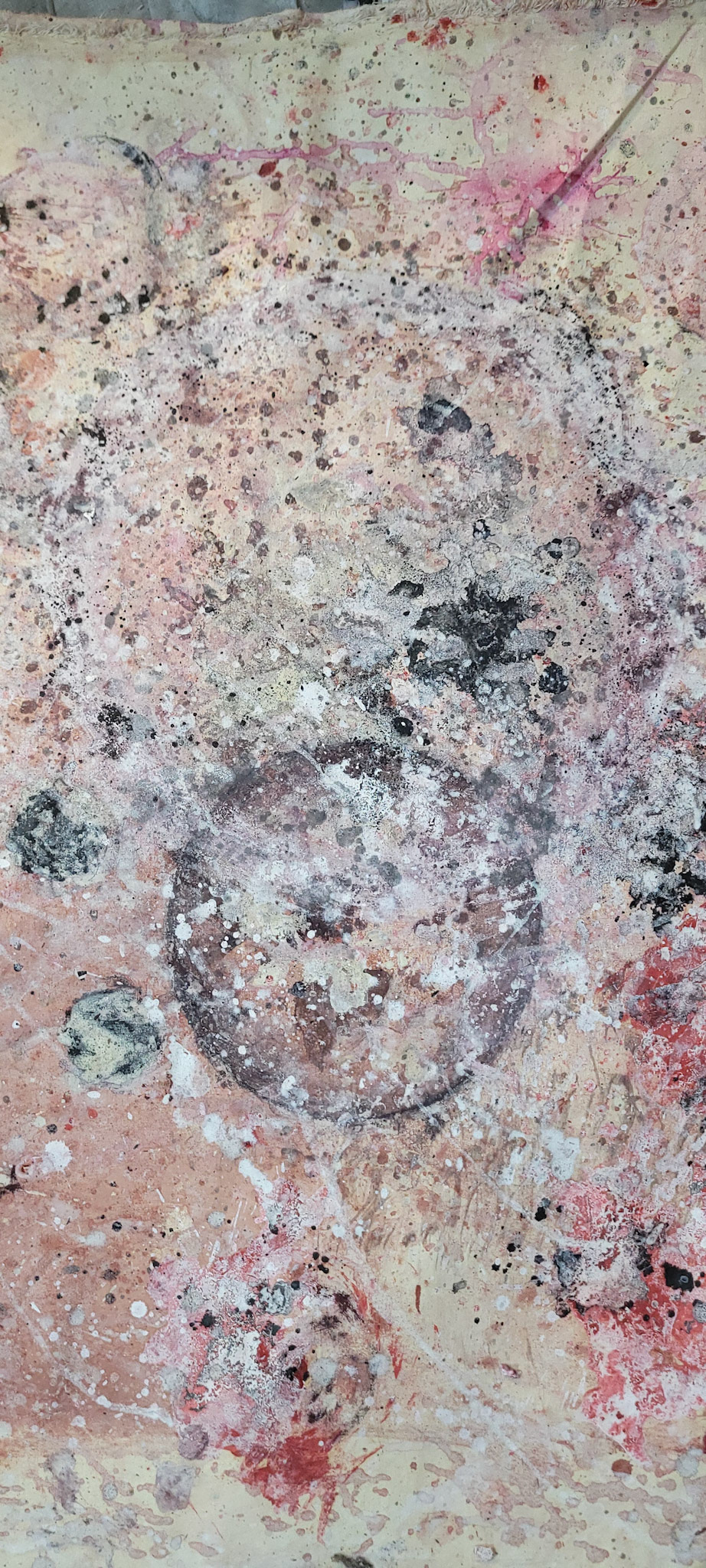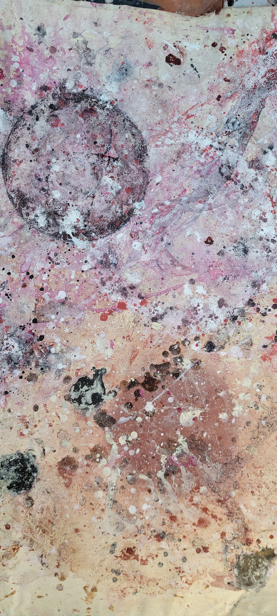 Aqui, onde o chão é mais que suporte — é ventre, húmus, carne da própria matéria pictórica — nascem gestos que não querem secar.