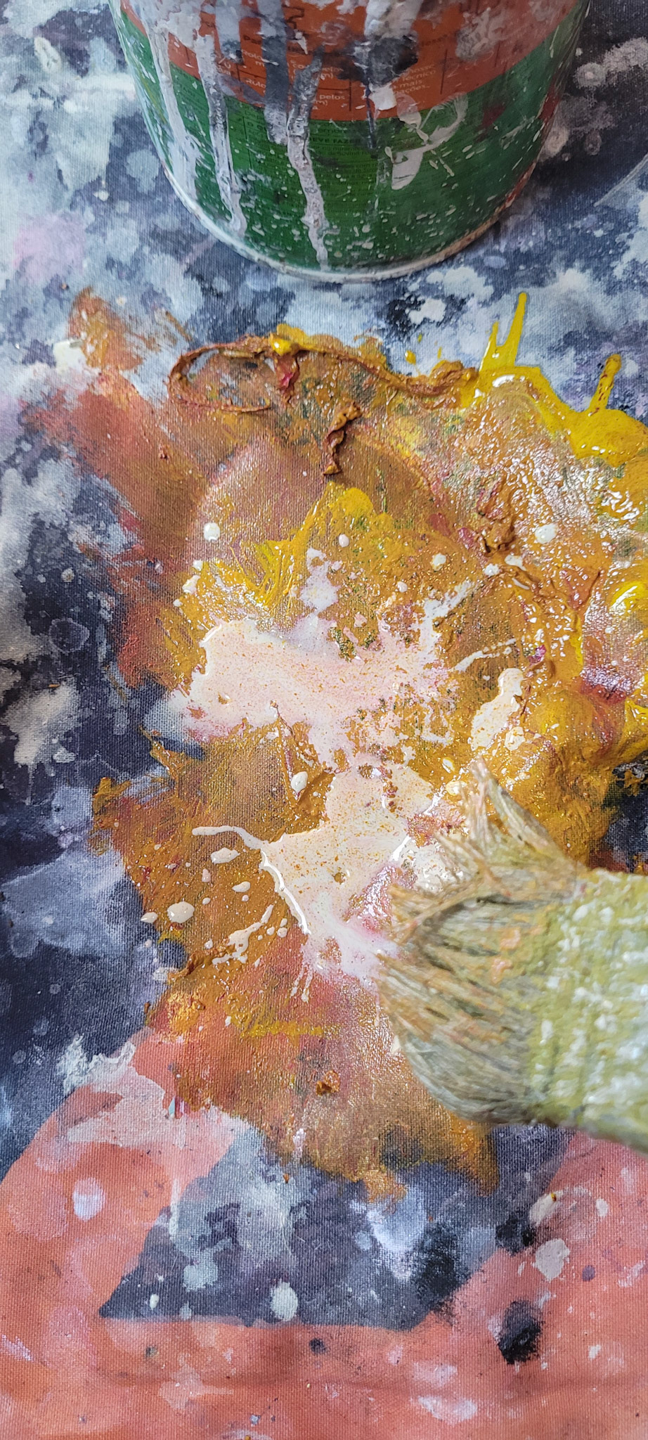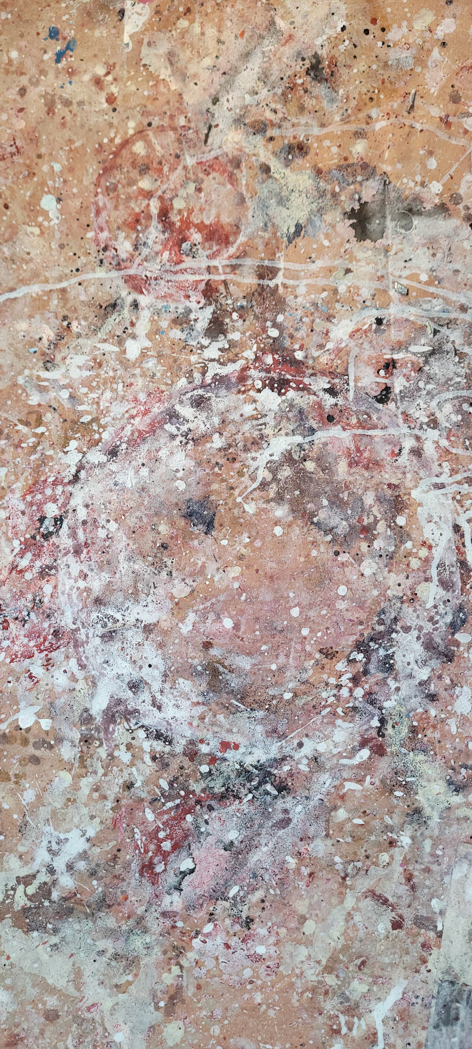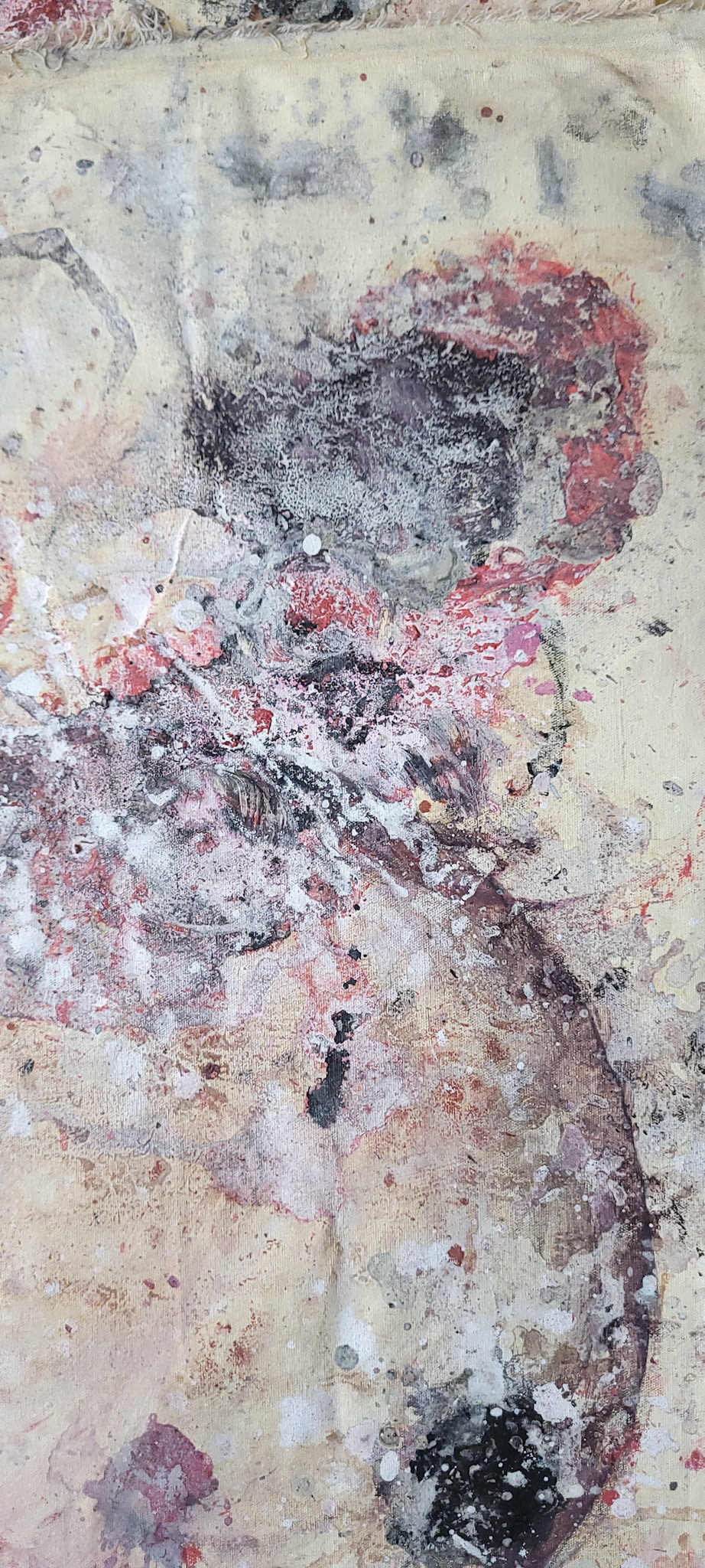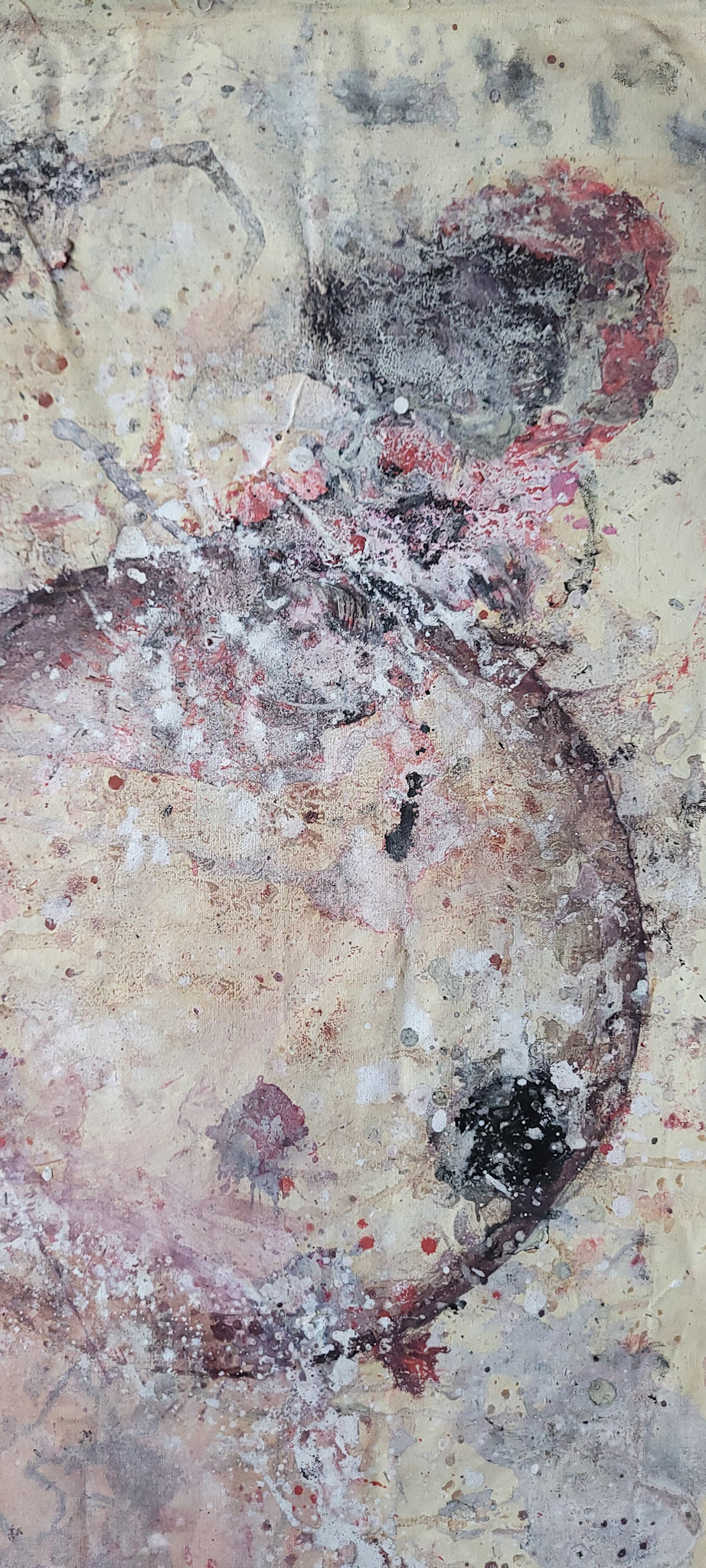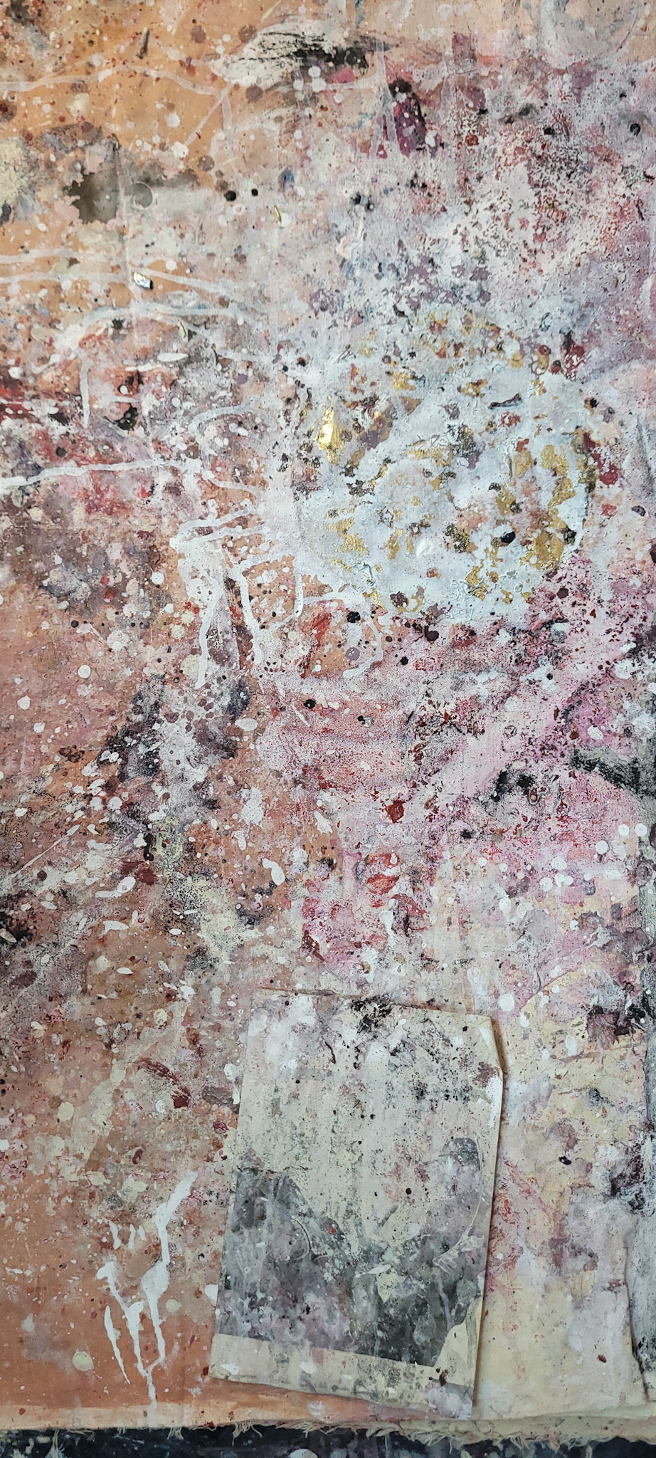 Aqui, onde o chão é mais que suporte — é ventre, húmus, carne da própria matéria pictórica — nascem gestos que não querem secar.