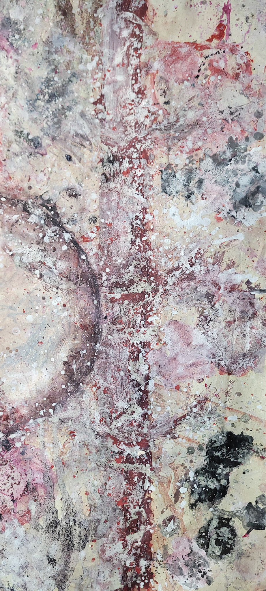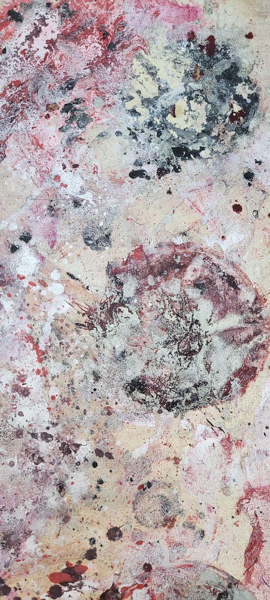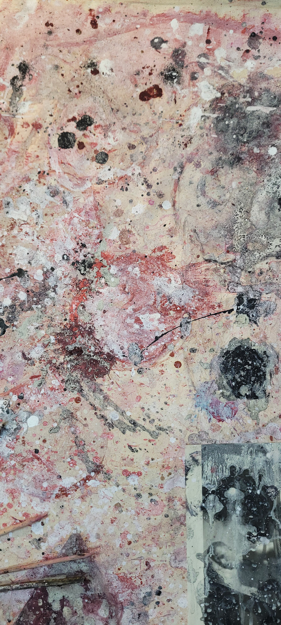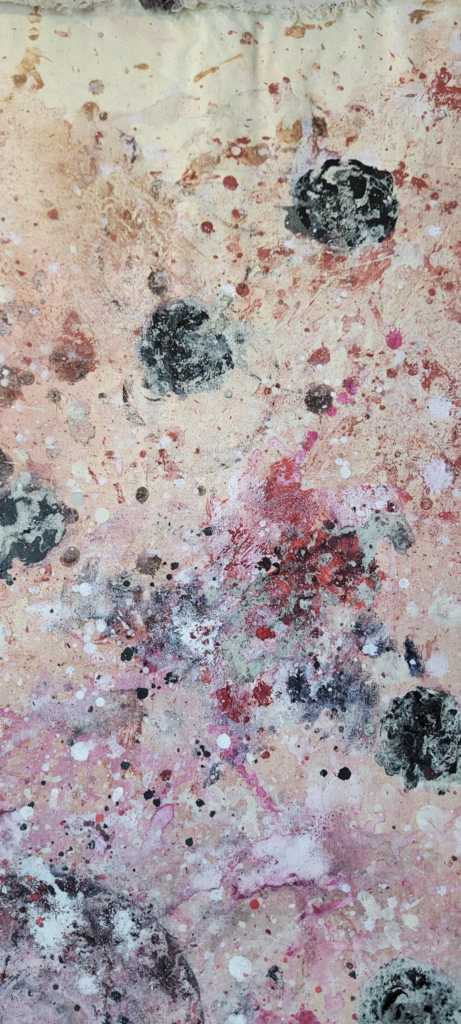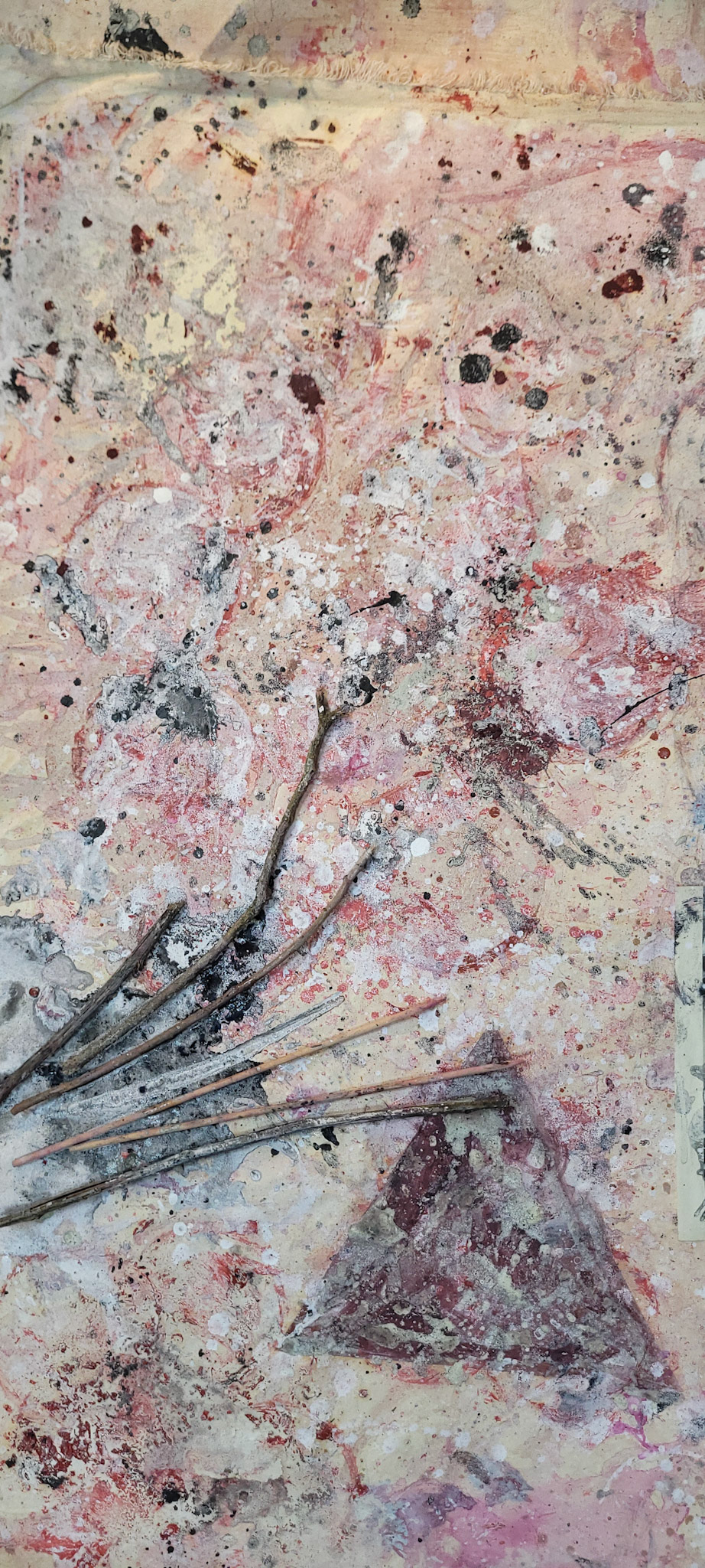 Aqui, onde o chão é mais que suporte — é ventre, húmus, carne da própria matéria pictórica — nascem gestos que não querem secar.