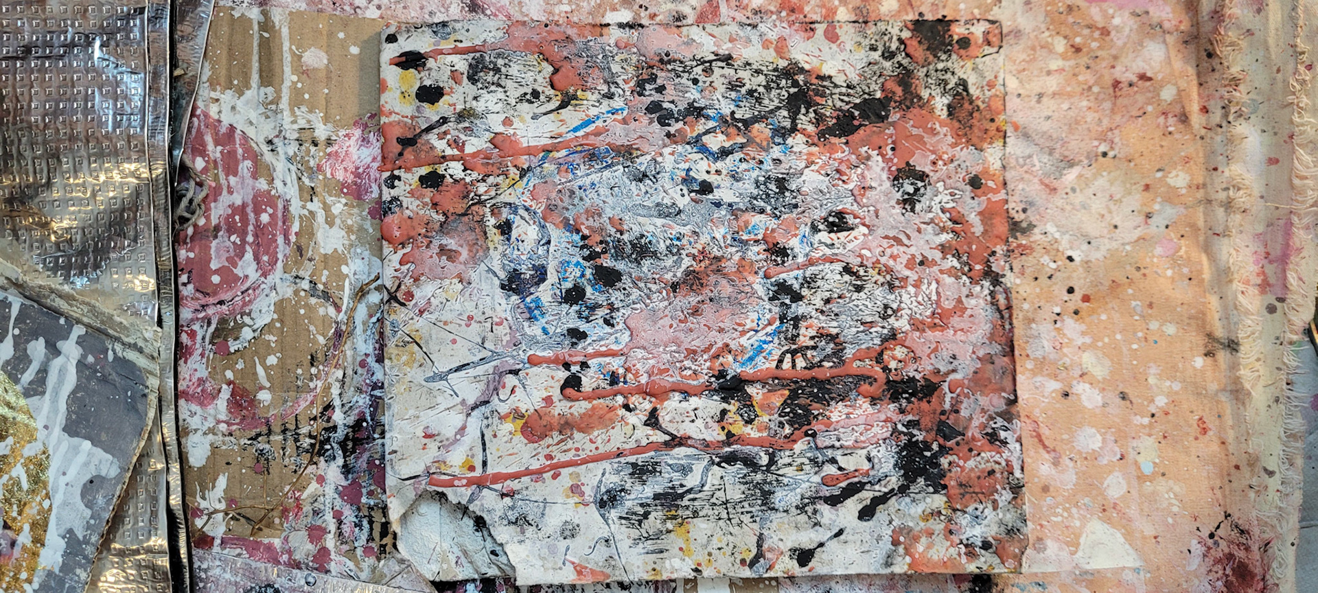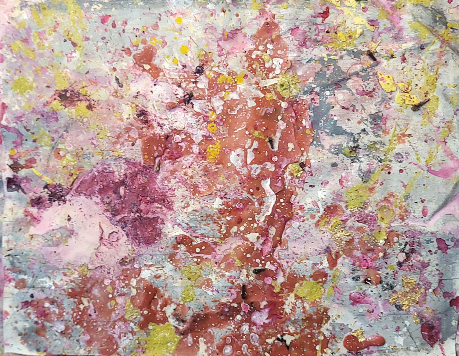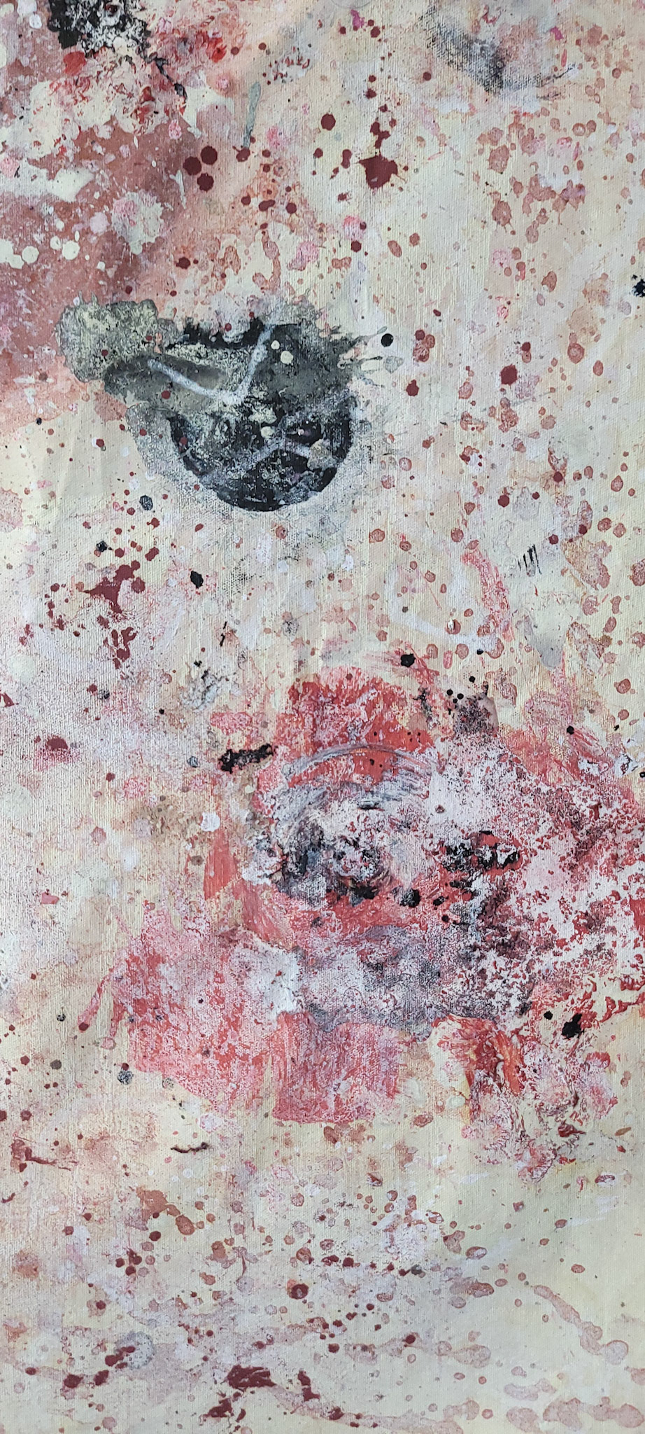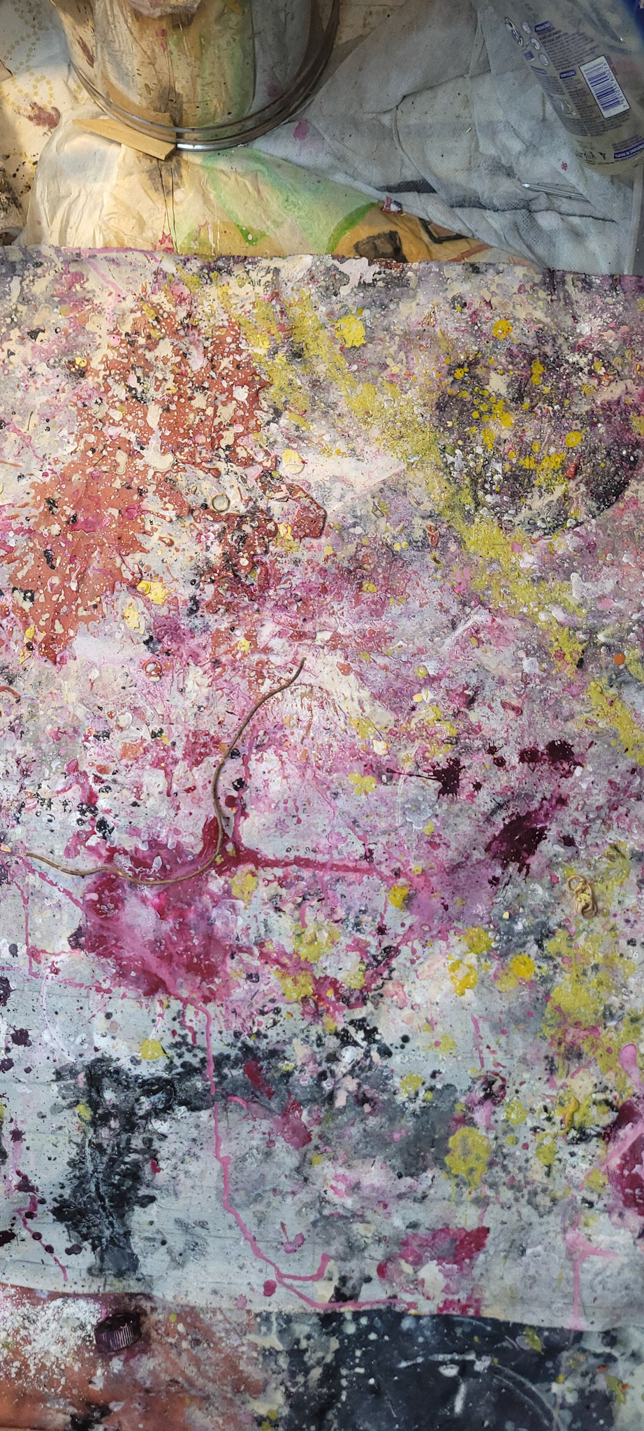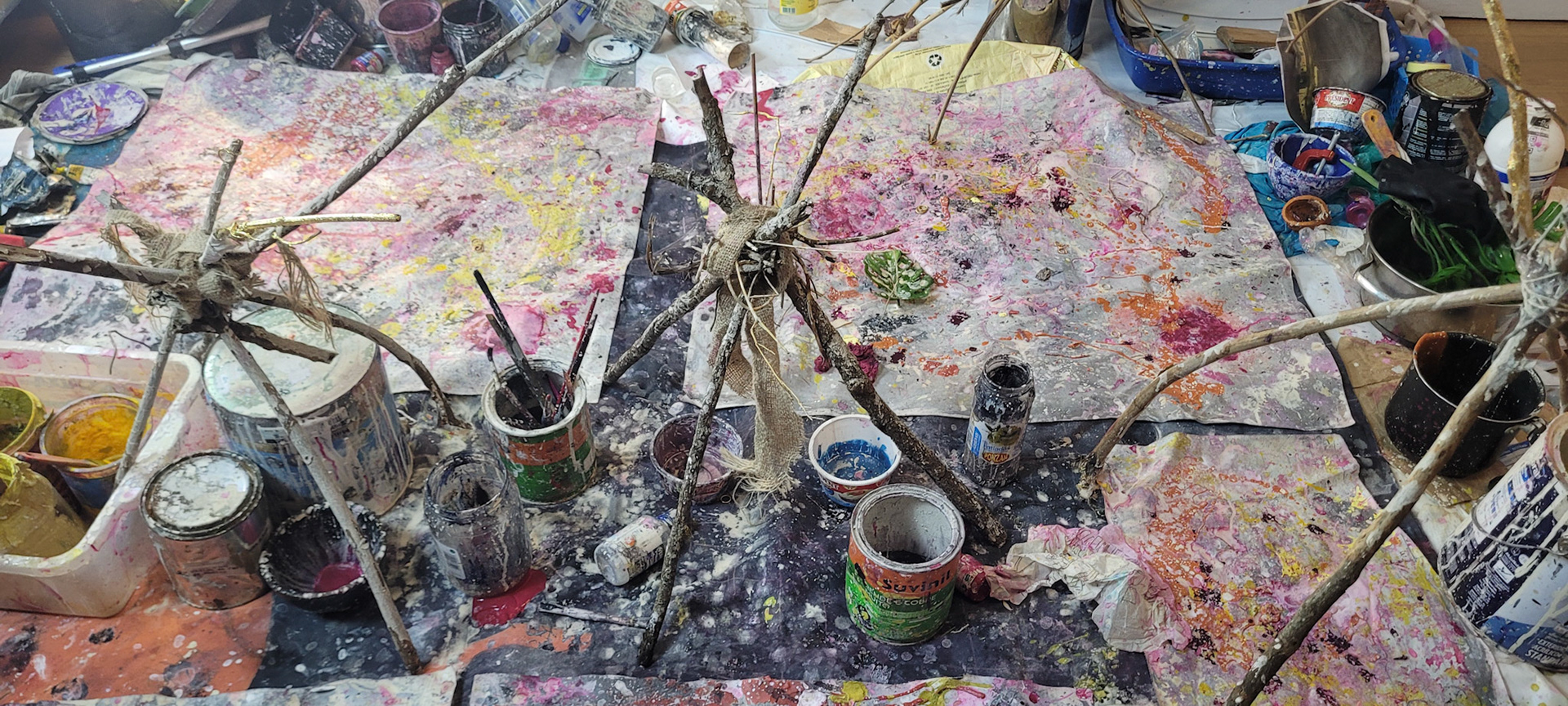 Aqui, onde o chão é mais que suporte — é ventre, húmus, carne da própria matéria pictórica — nascem gestos que não querem secar.
