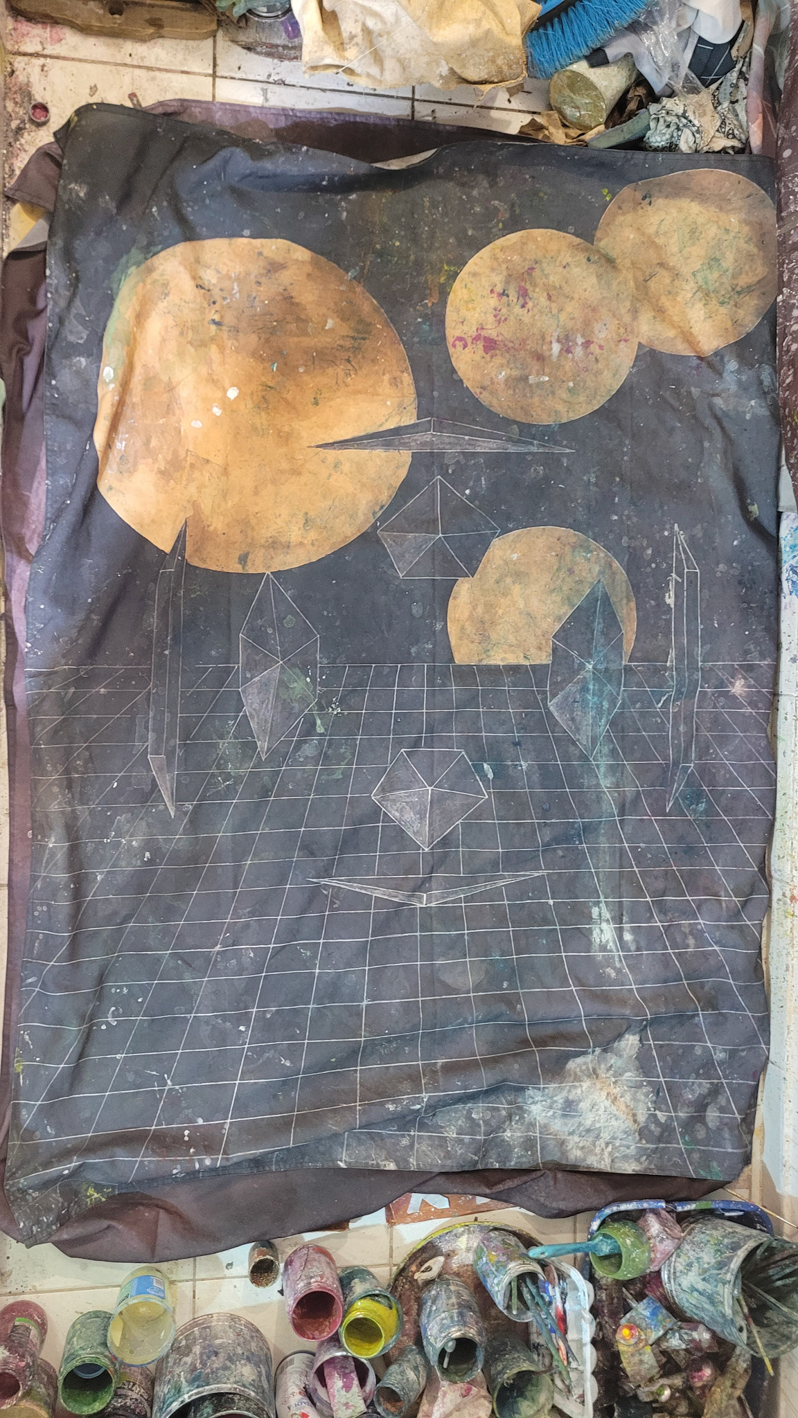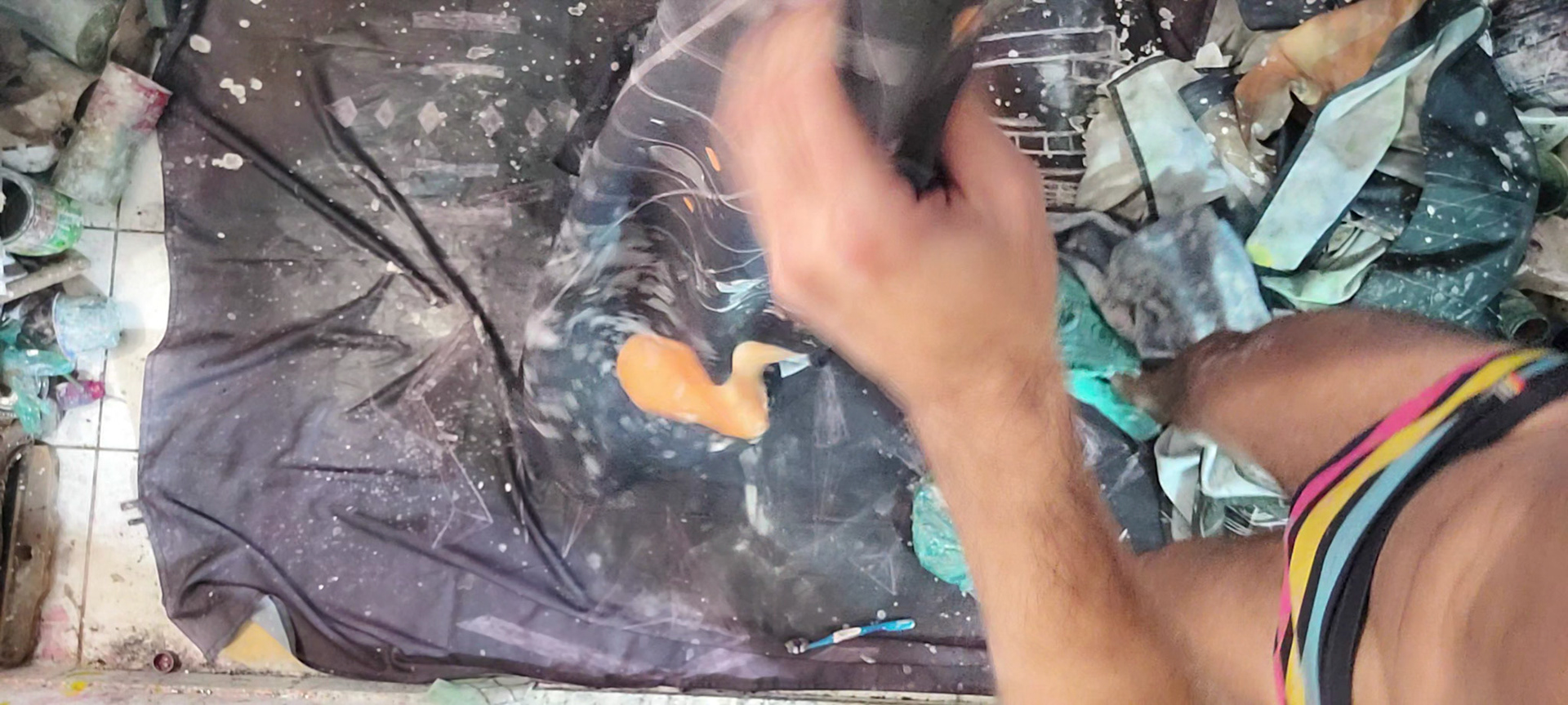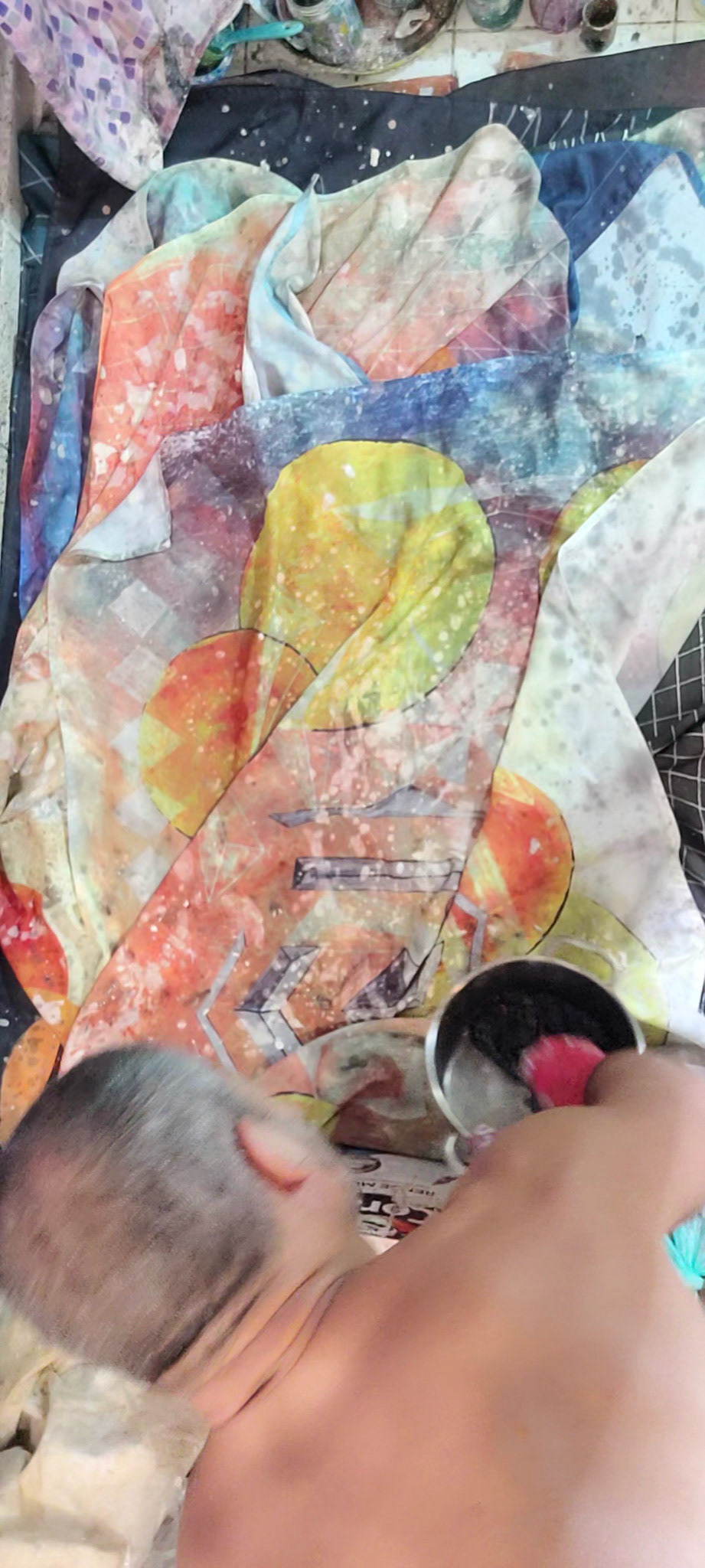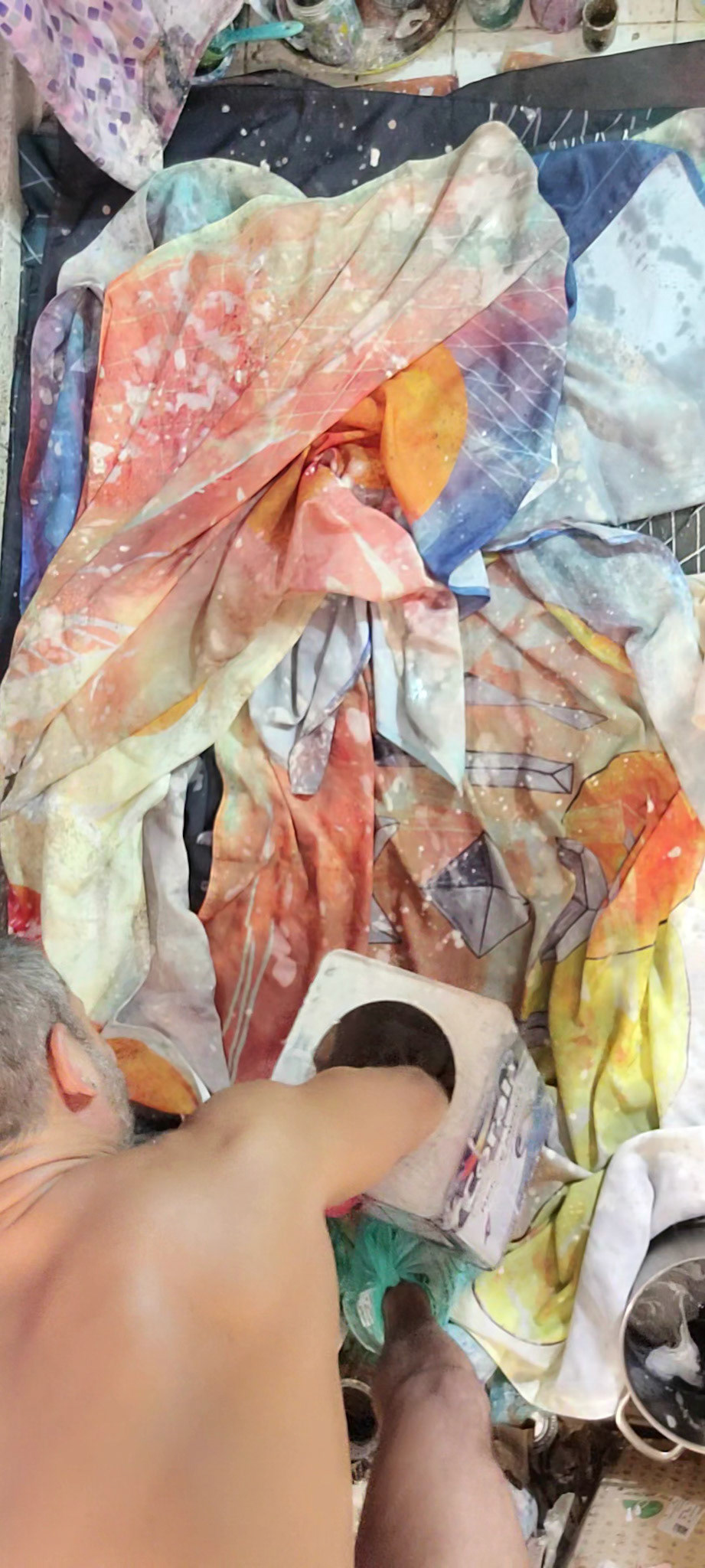 No chão, a preparação começou cedo — como um ritual sem nome. O tecido se estende sobre a superfície do mundo como uma pele ofertada. A tinta preta para tecido, a acrílica palha, os gestos quase litúrgicos. E o corpo, em silêncio, dialoga com a matéria.