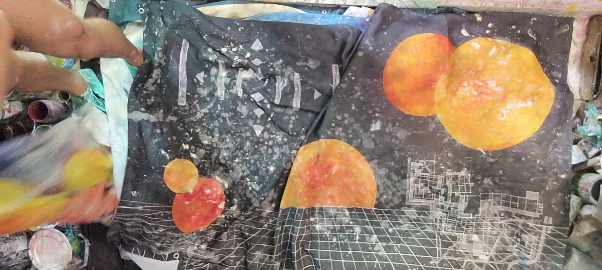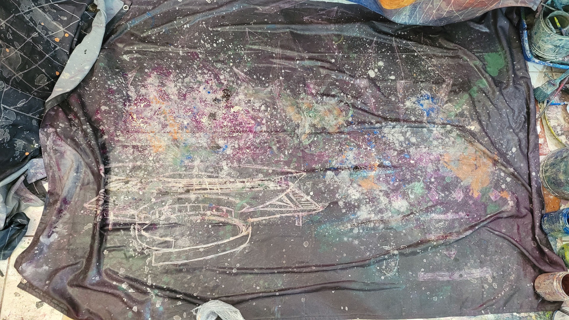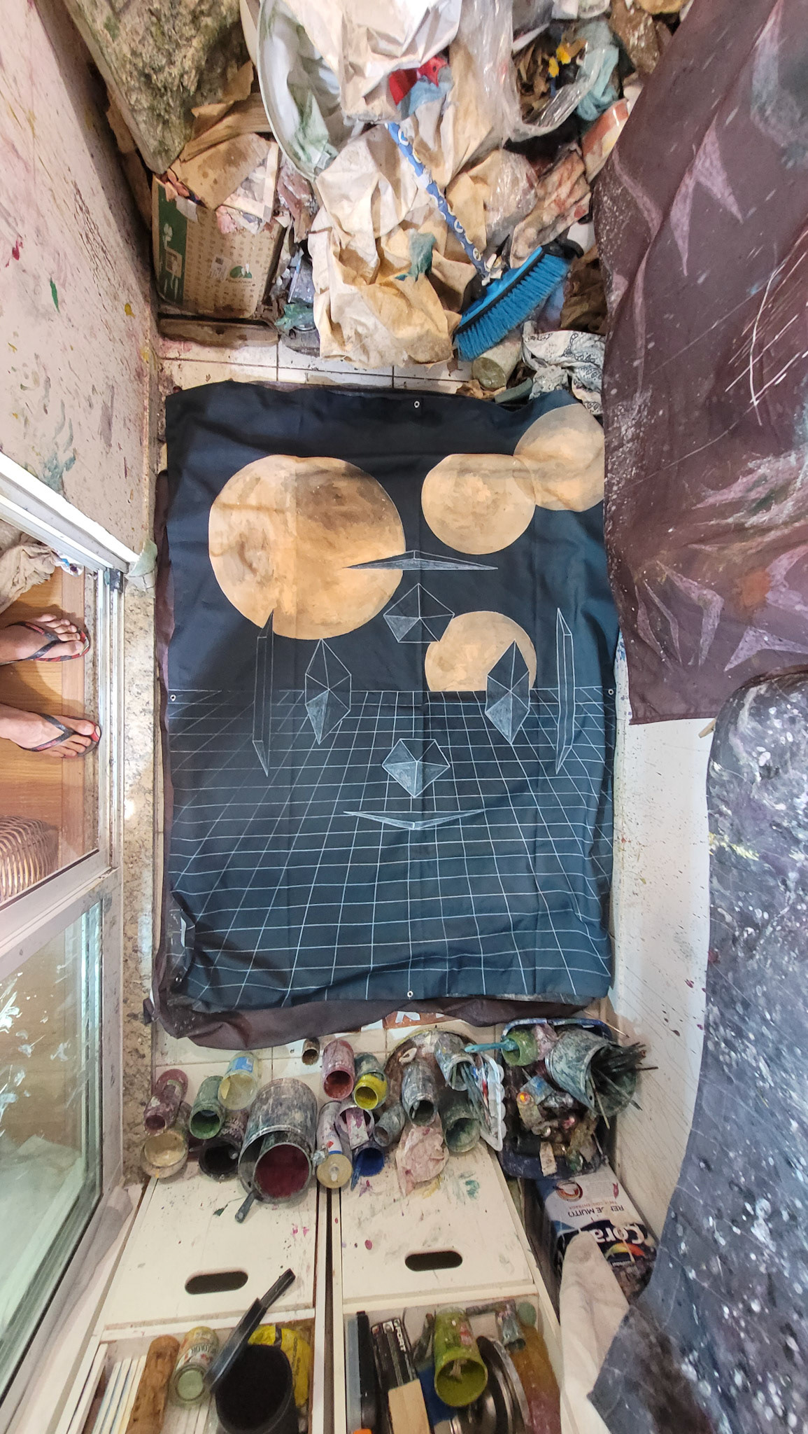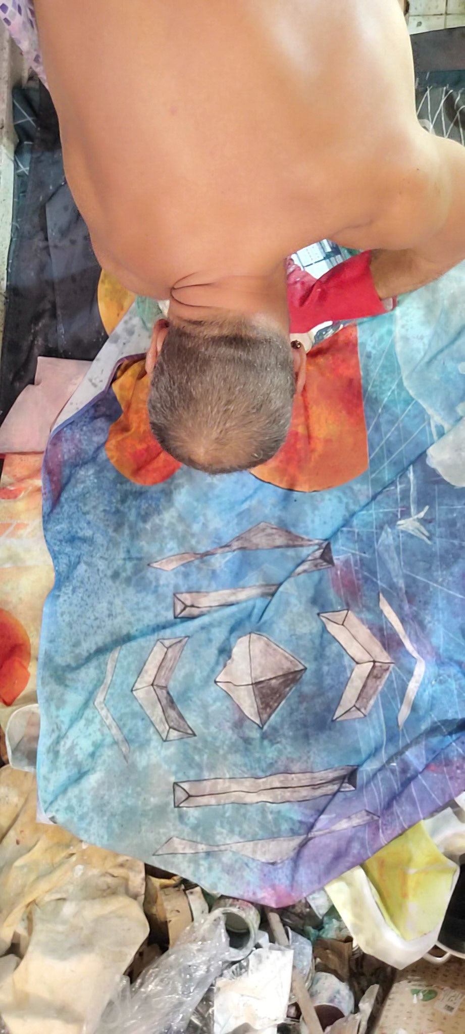 No chão, a preparação começou cedo — como um ritual sem nome. O tecido se estende sobre a superfície do mundo como uma pele ofertada. A tinta preta para tecido, a acrílica palha, os gestos quase litúrgicos. E o corpo, em silêncio, dialoga com a matéria.