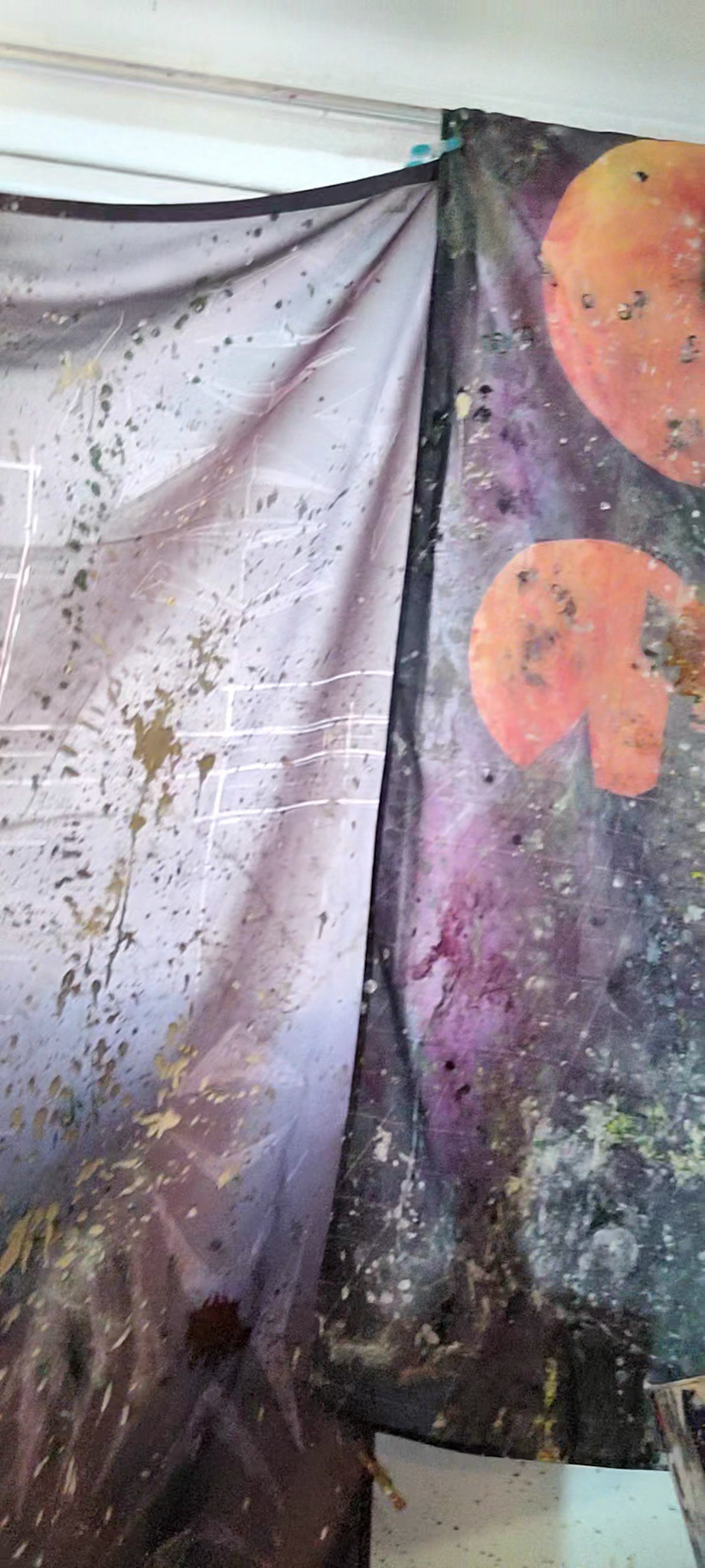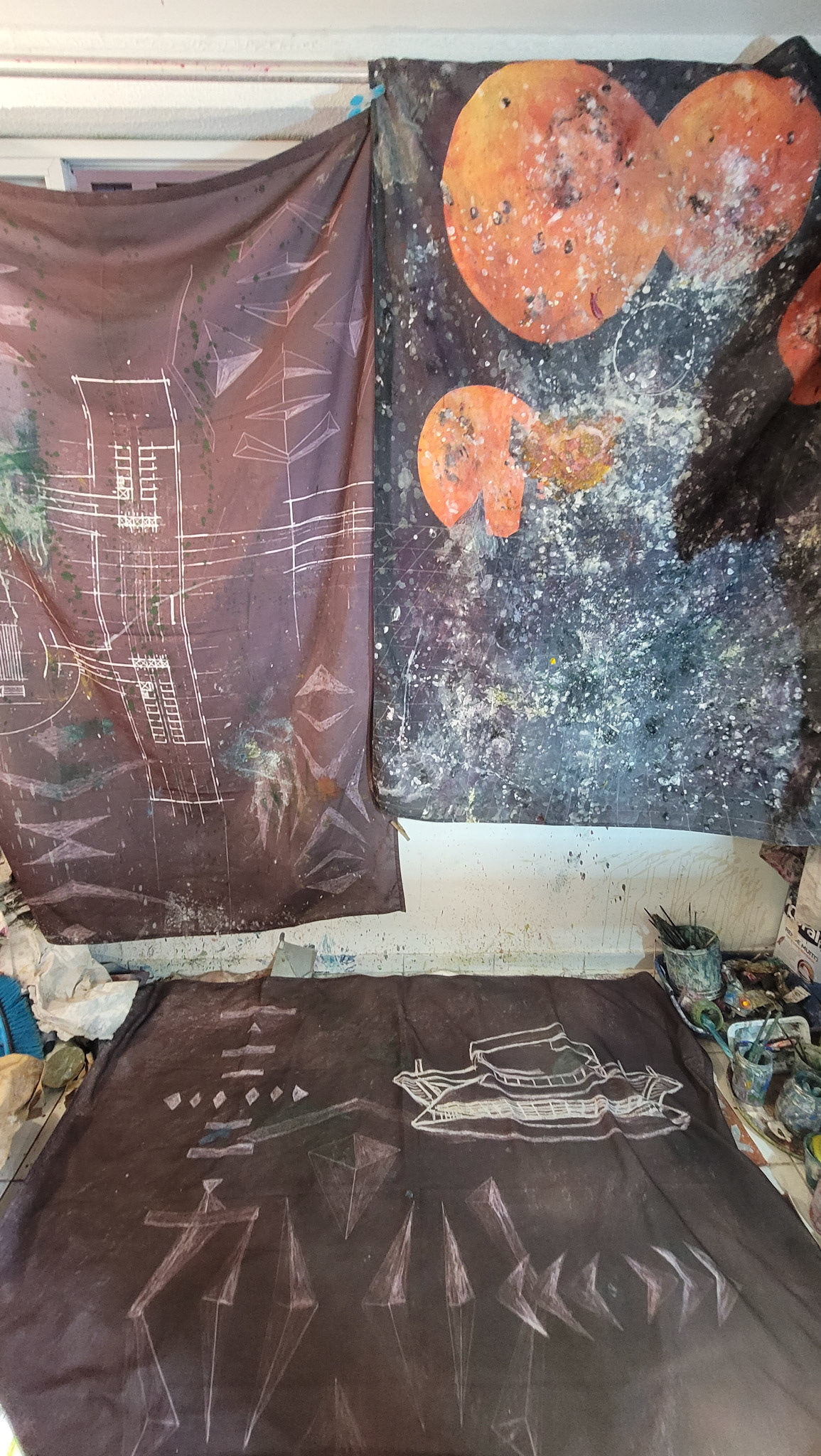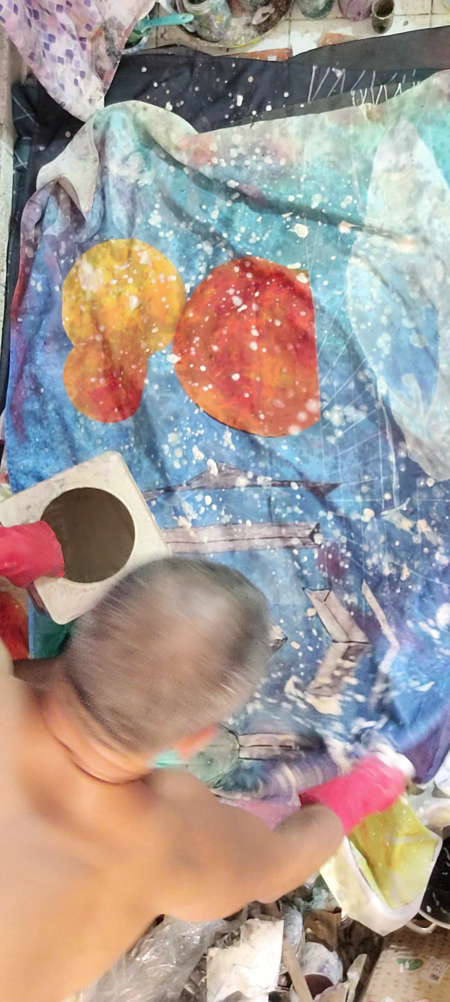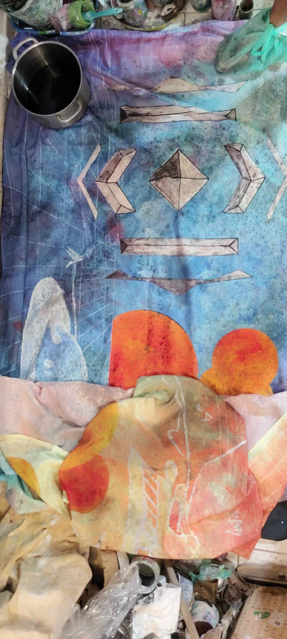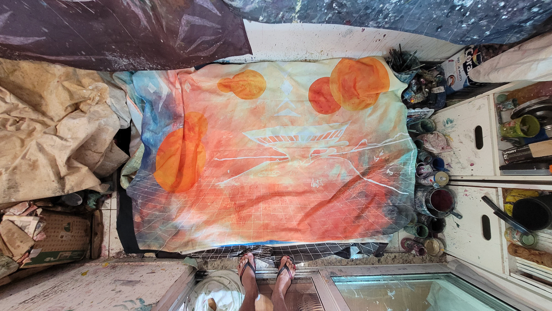 No chão, a preparação começou cedo — como um ritual sem nome. O tecido se estende sobre a superfície do mundo como uma pele ofertada. A tinta preta para tecido, a acrílica palha, os gestos quase litúrgicos. E o corpo, em silêncio, dialoga com a matéria.