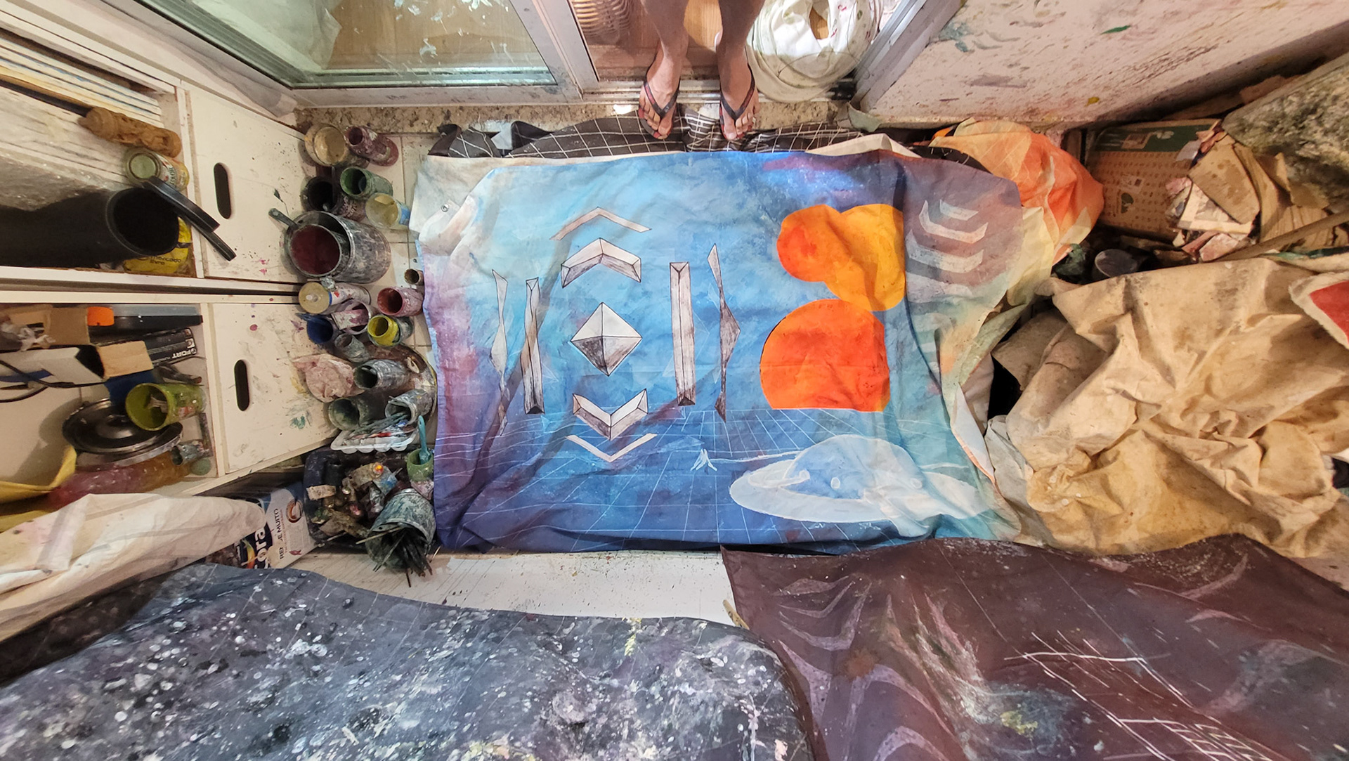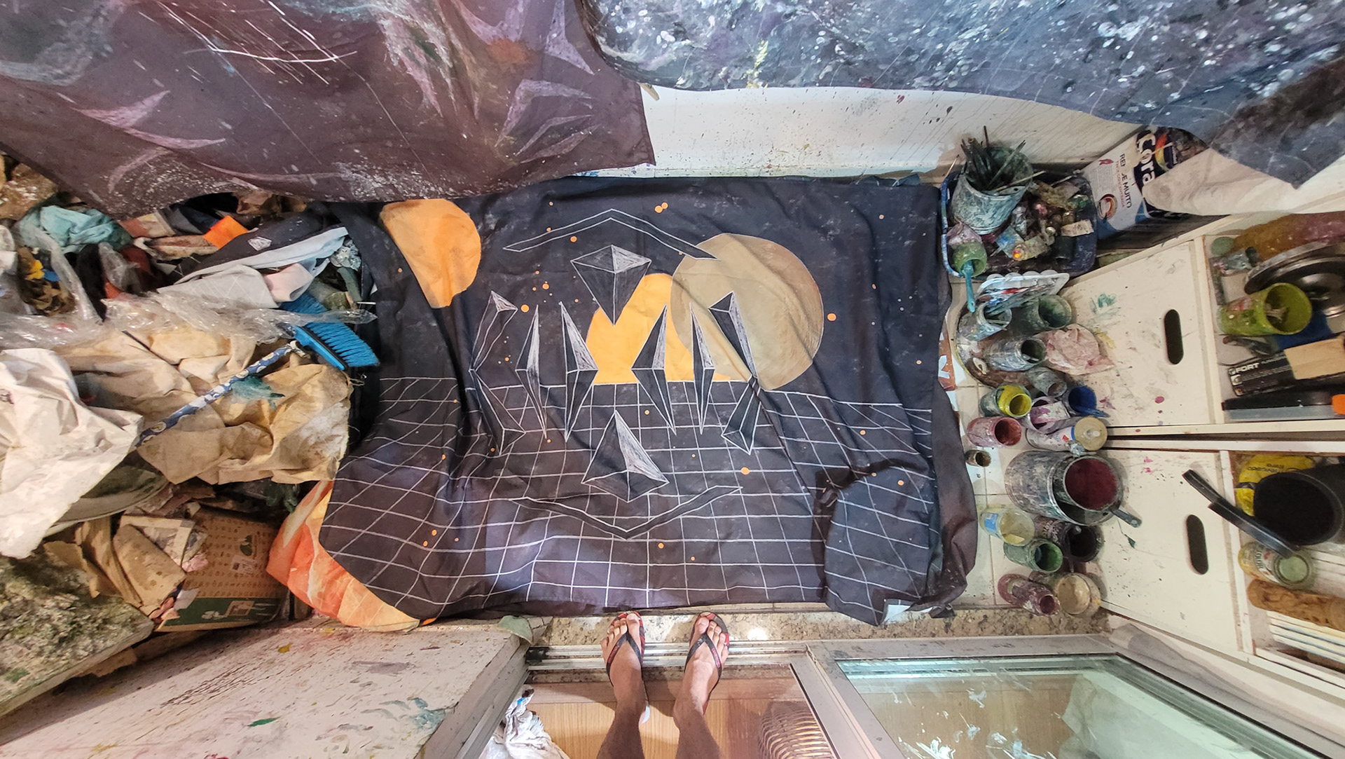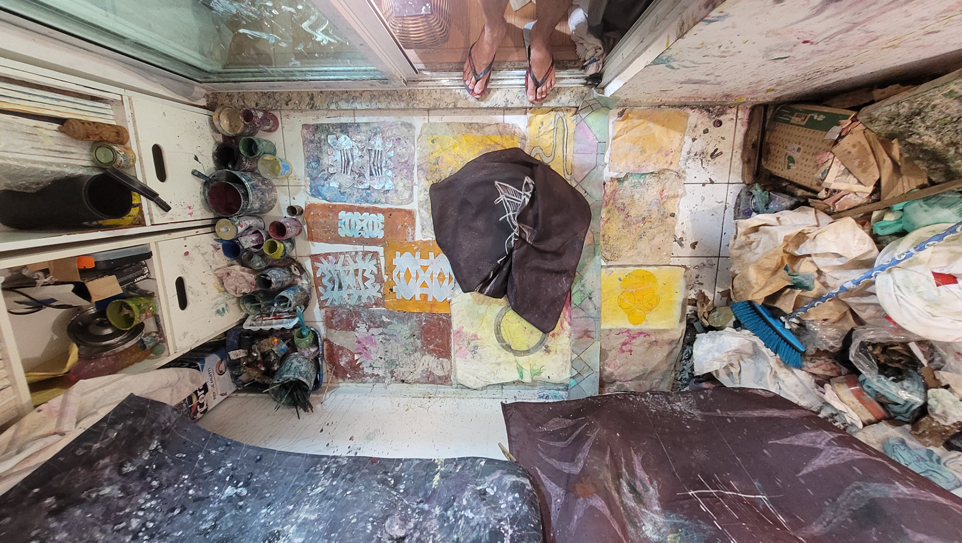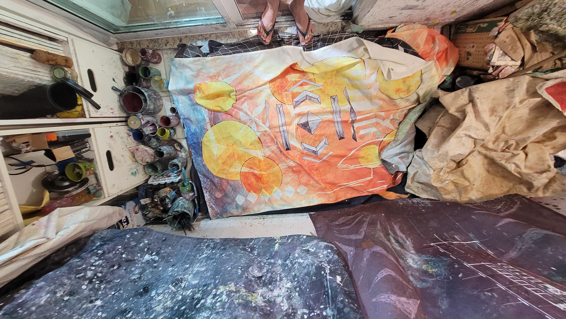 No chão, a preparação começou cedo — como um ritual sem nome. O tecido se estende sobre a superfície do mundo como uma pele ofertada. A tinta preta para tecido, a acrílica palha, os gestos quase litúrgicos. E o corpo, em silêncio, dialoga com a matéria.