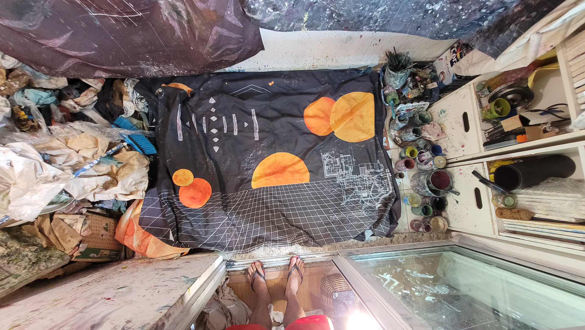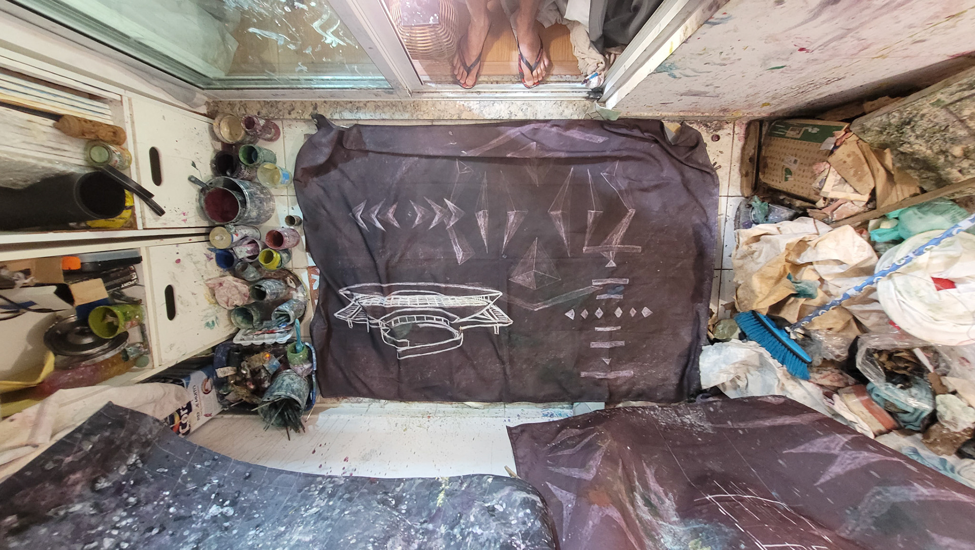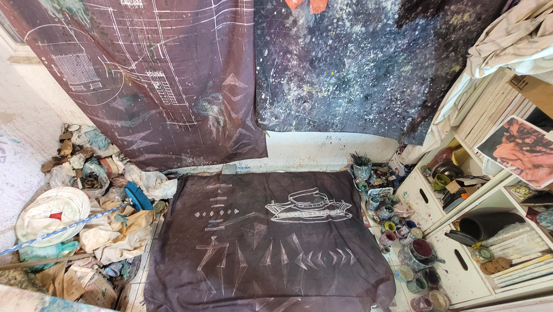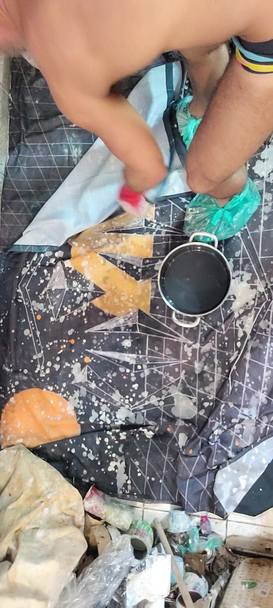 No chão, a preparação começou cedo — como um ritual sem nome. O tecido se estende sobre a superfície do mundo como uma pele ofertada. A tinta preta para tecido, a acrílica palha, os gestos quase litúrgicos. E o corpo, em silêncio, dialoga com a matéria.