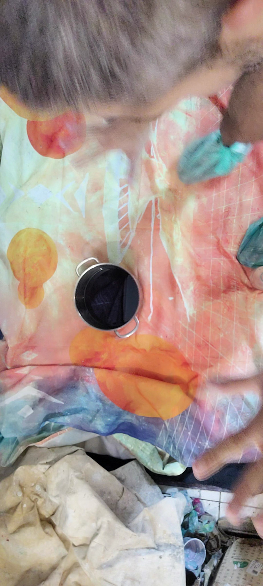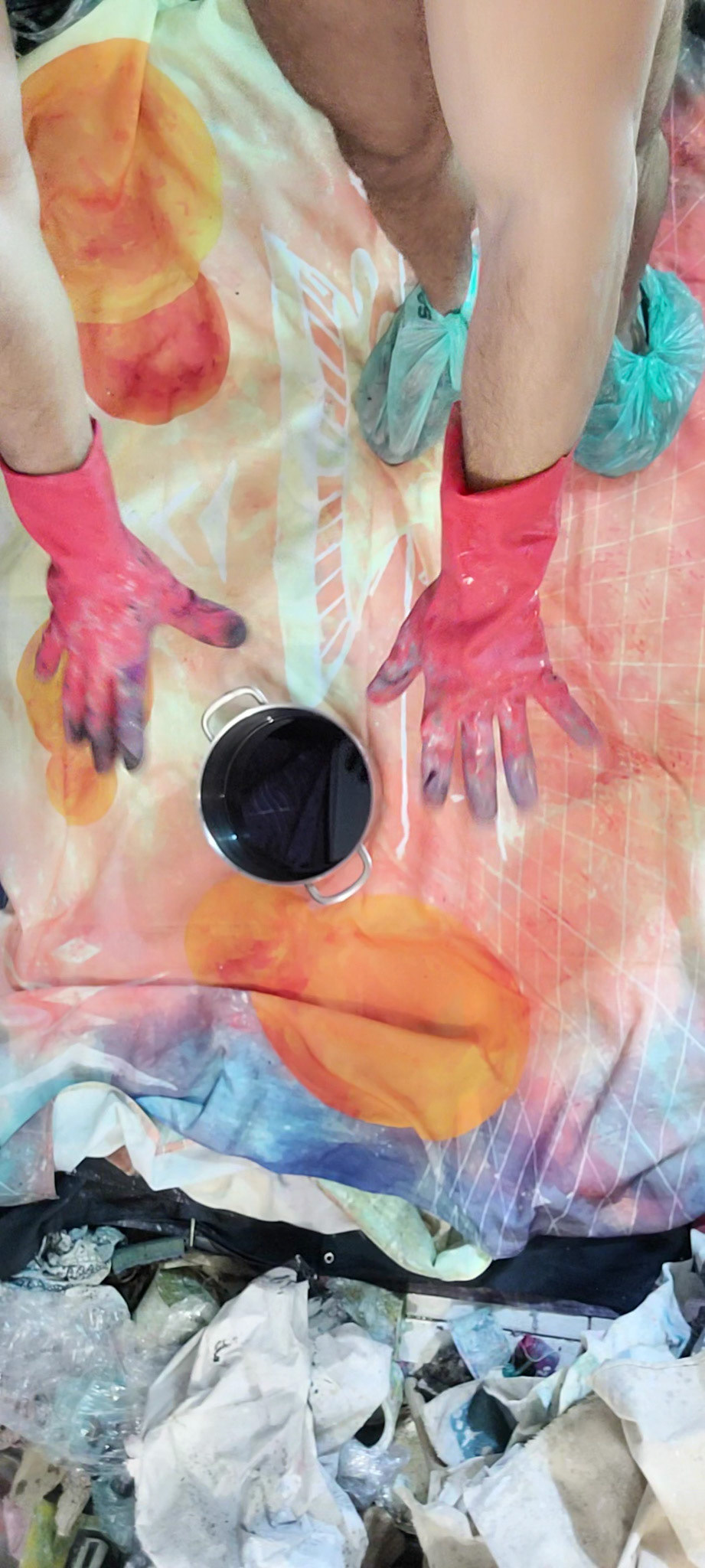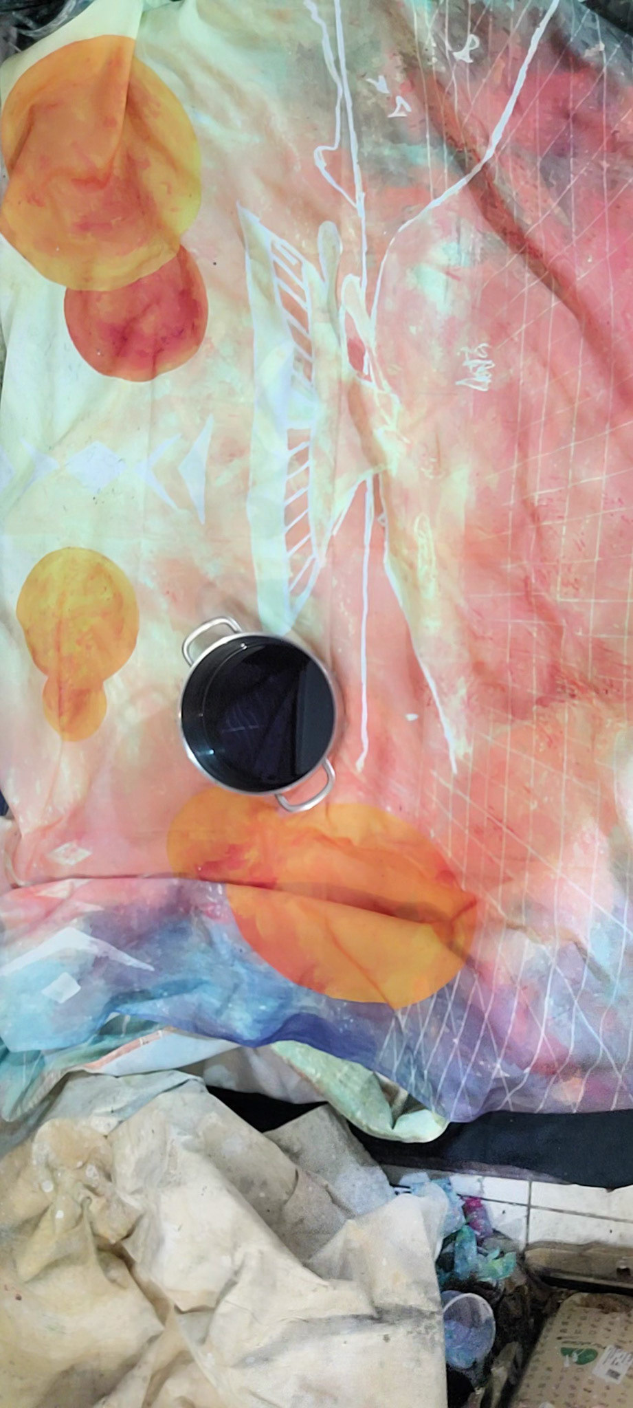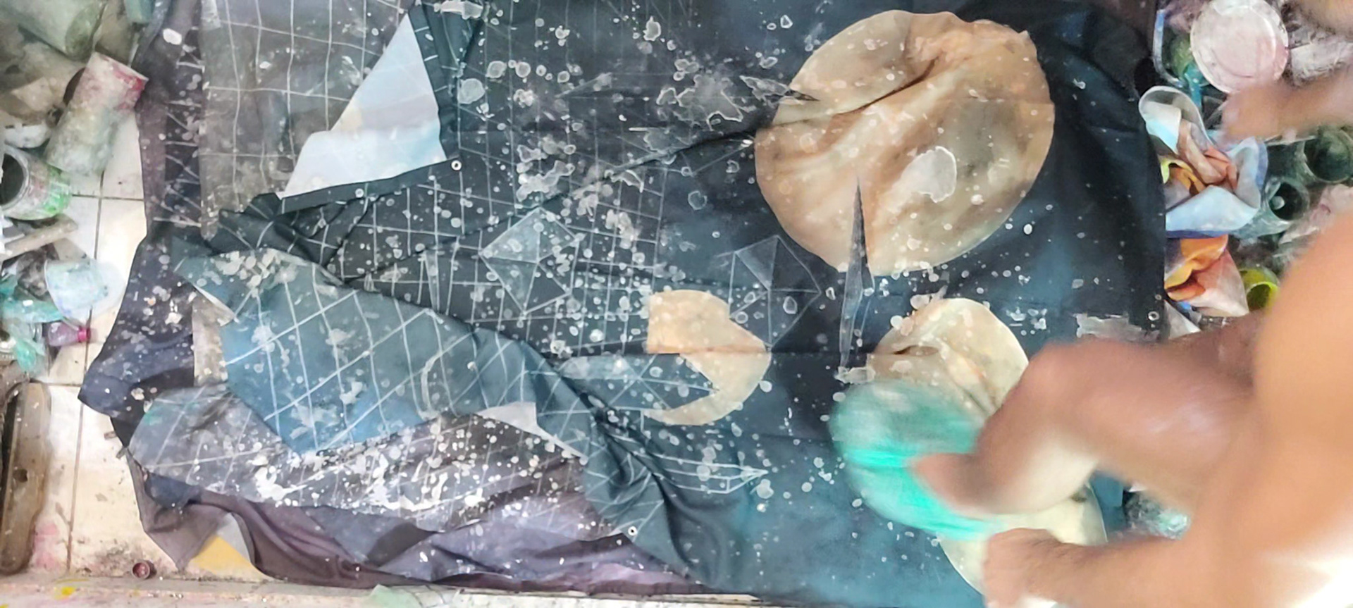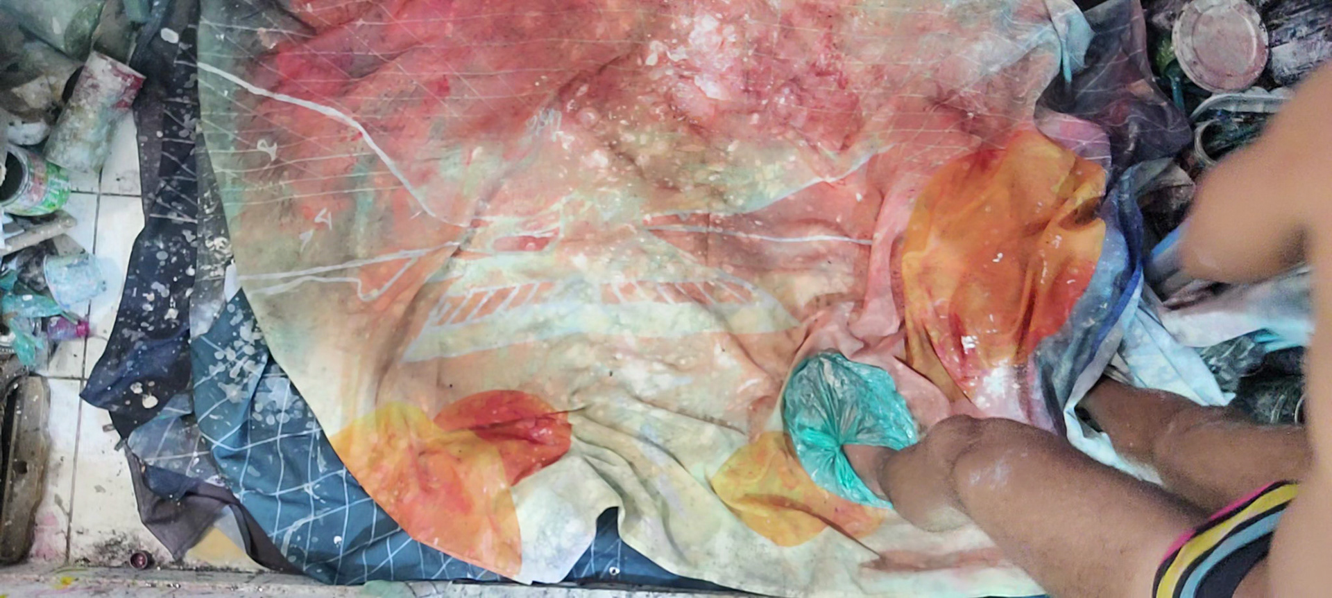 Essa etapa do tingimento não só documenta o processo, mas afirma o gesto como pintura em movimento, quase uma performance-palimpsesto: o chão vira constelação e o tecido, membrana de passagem.