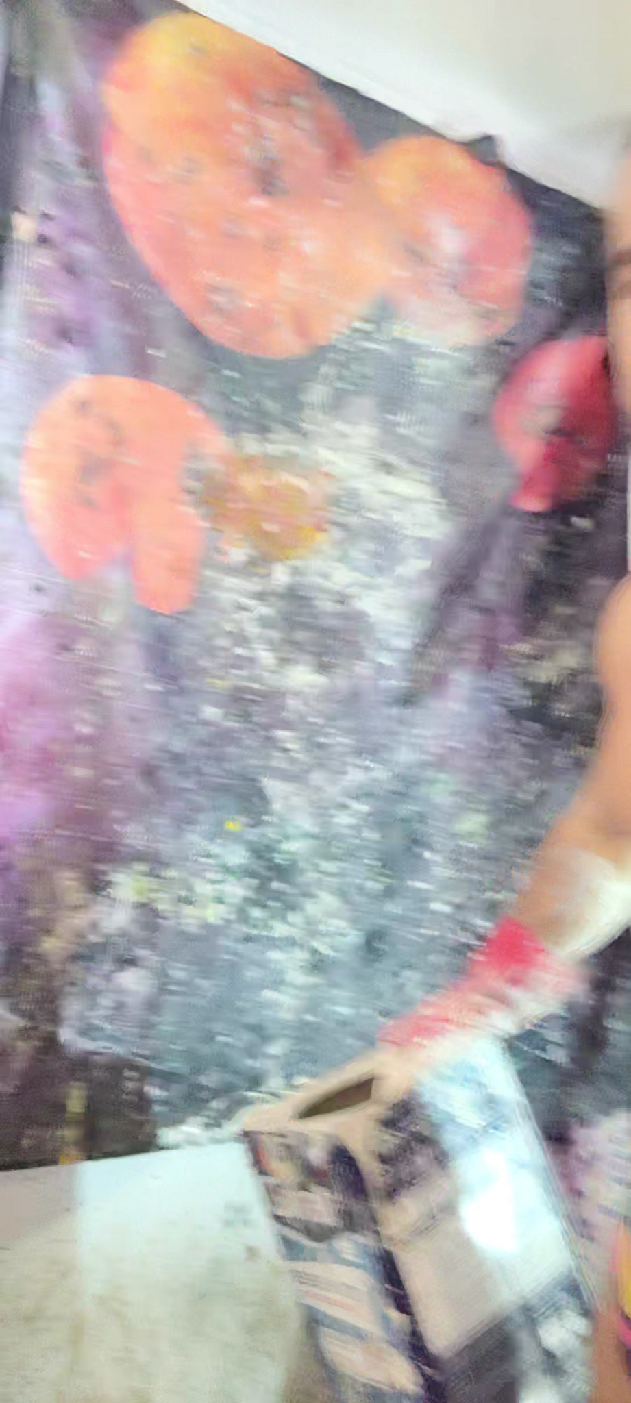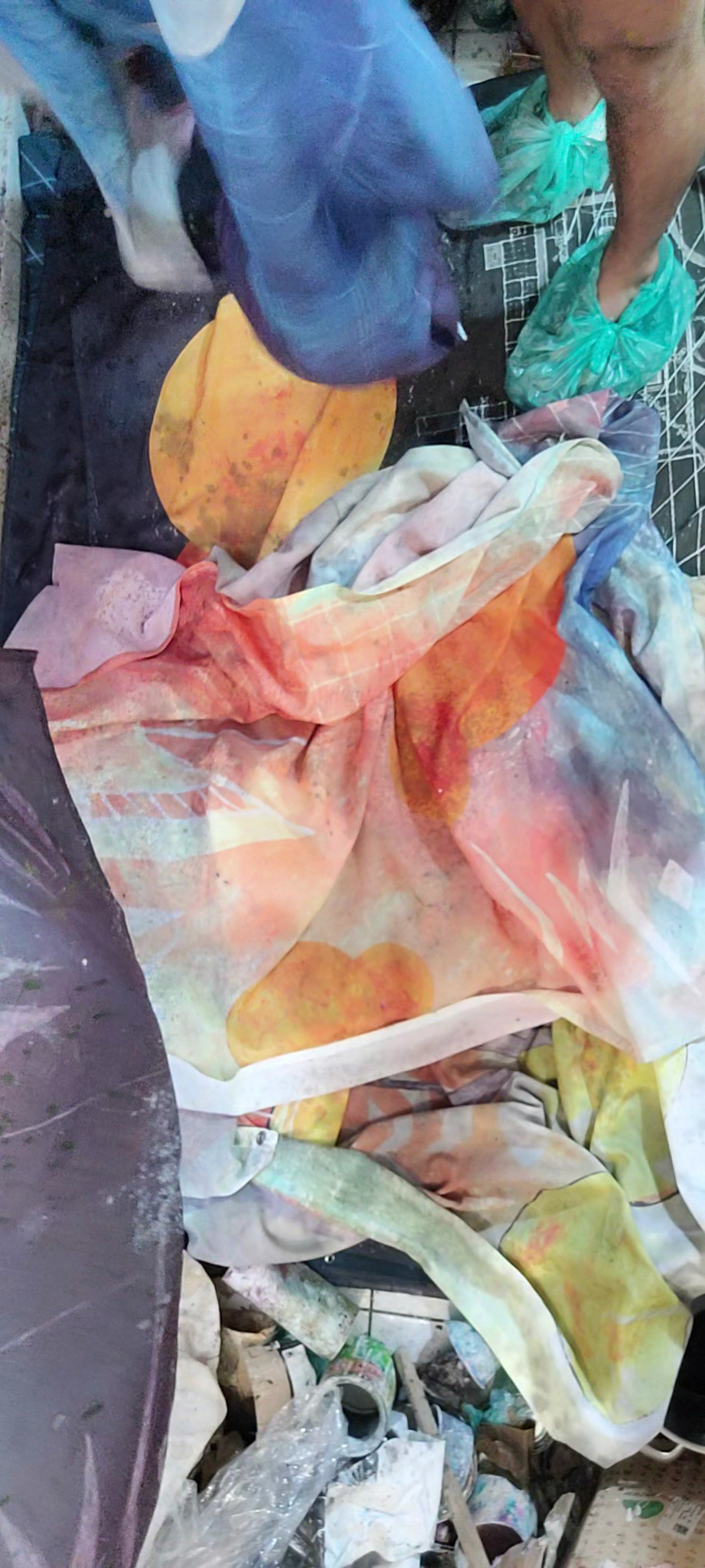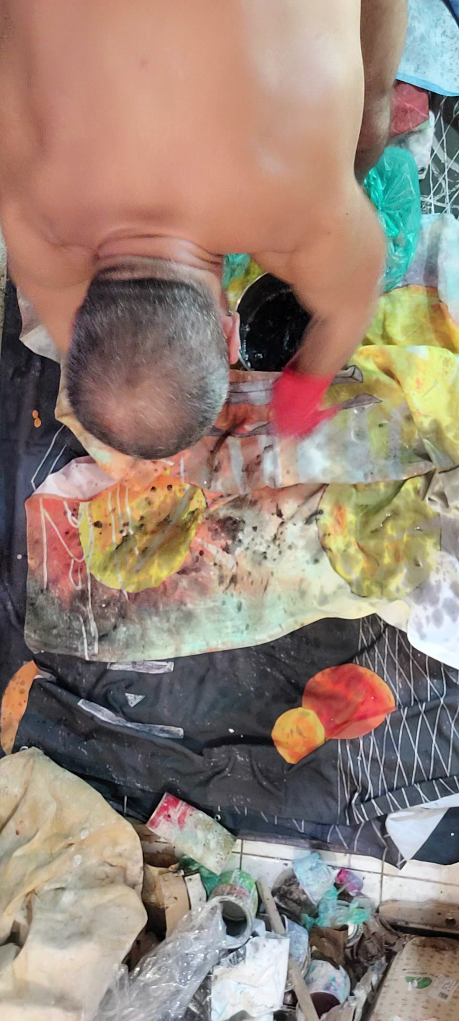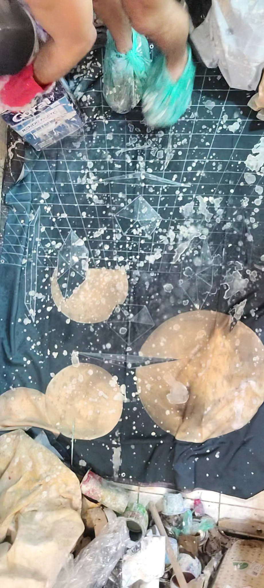 Essa etapa do tingimento não só documenta o processo, mas afirma o gesto como pintura em movimento, quase uma performance-palimpsesto: o chão vira constelação e o tecido, membrana de passagem.