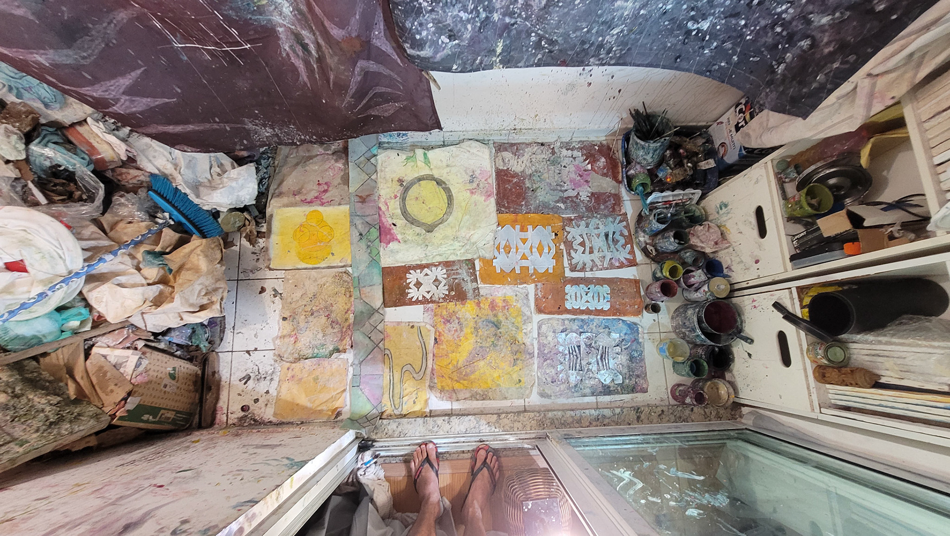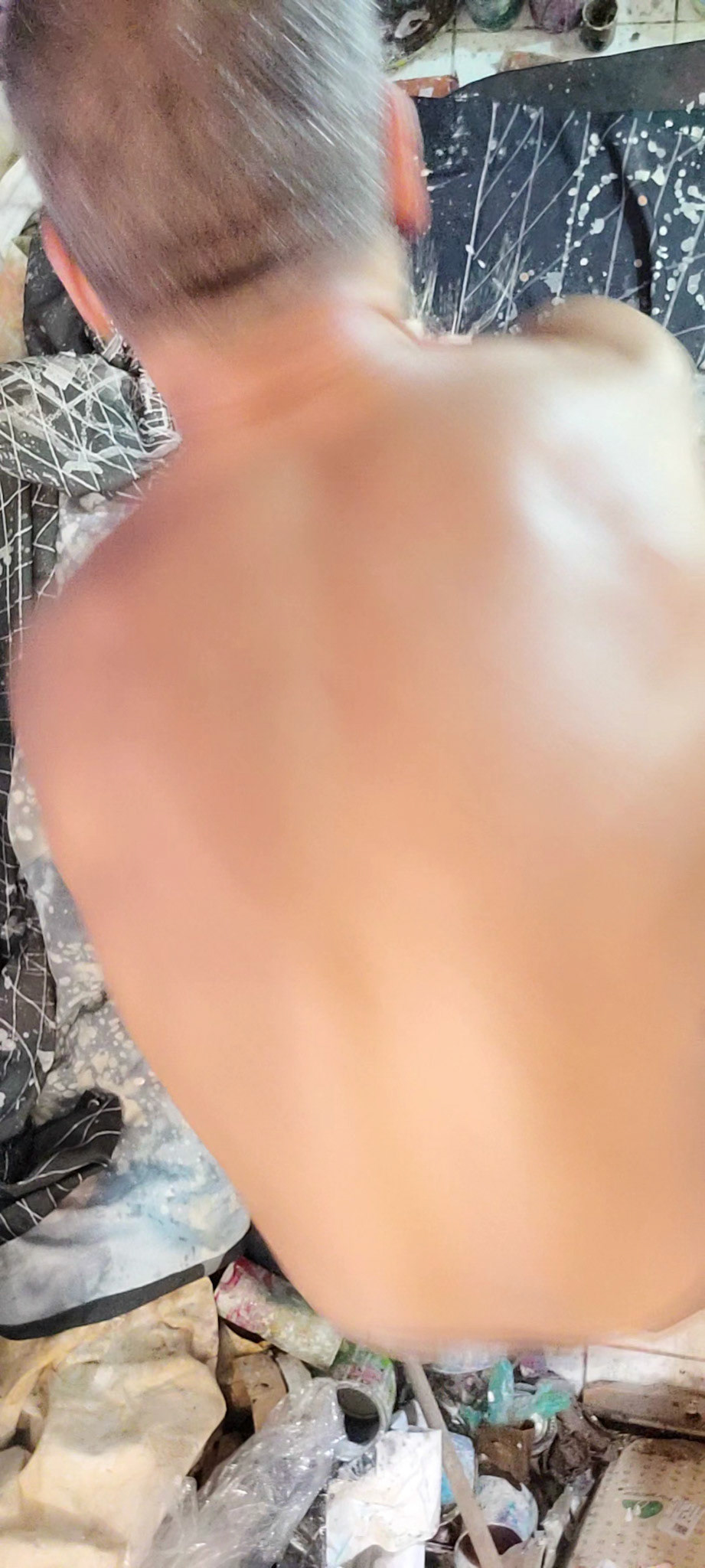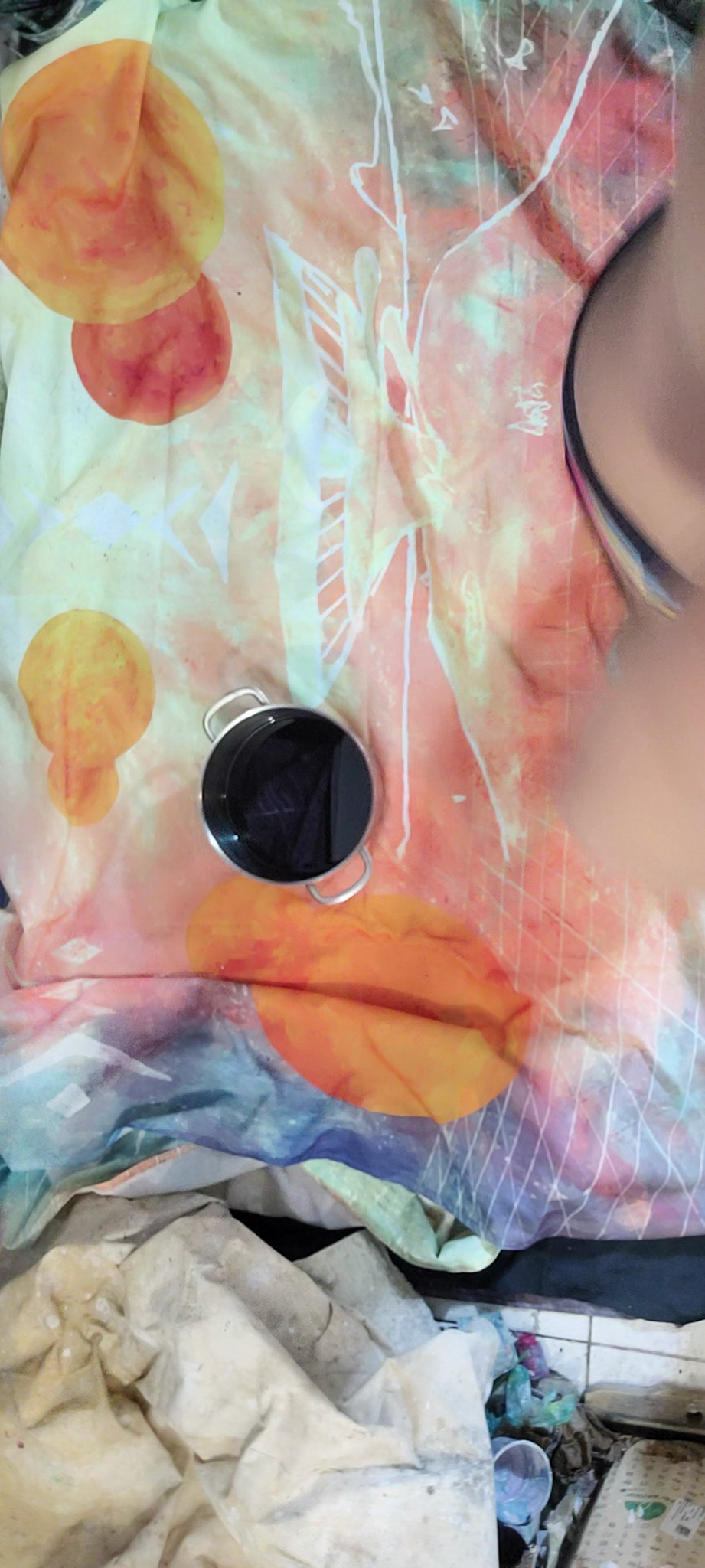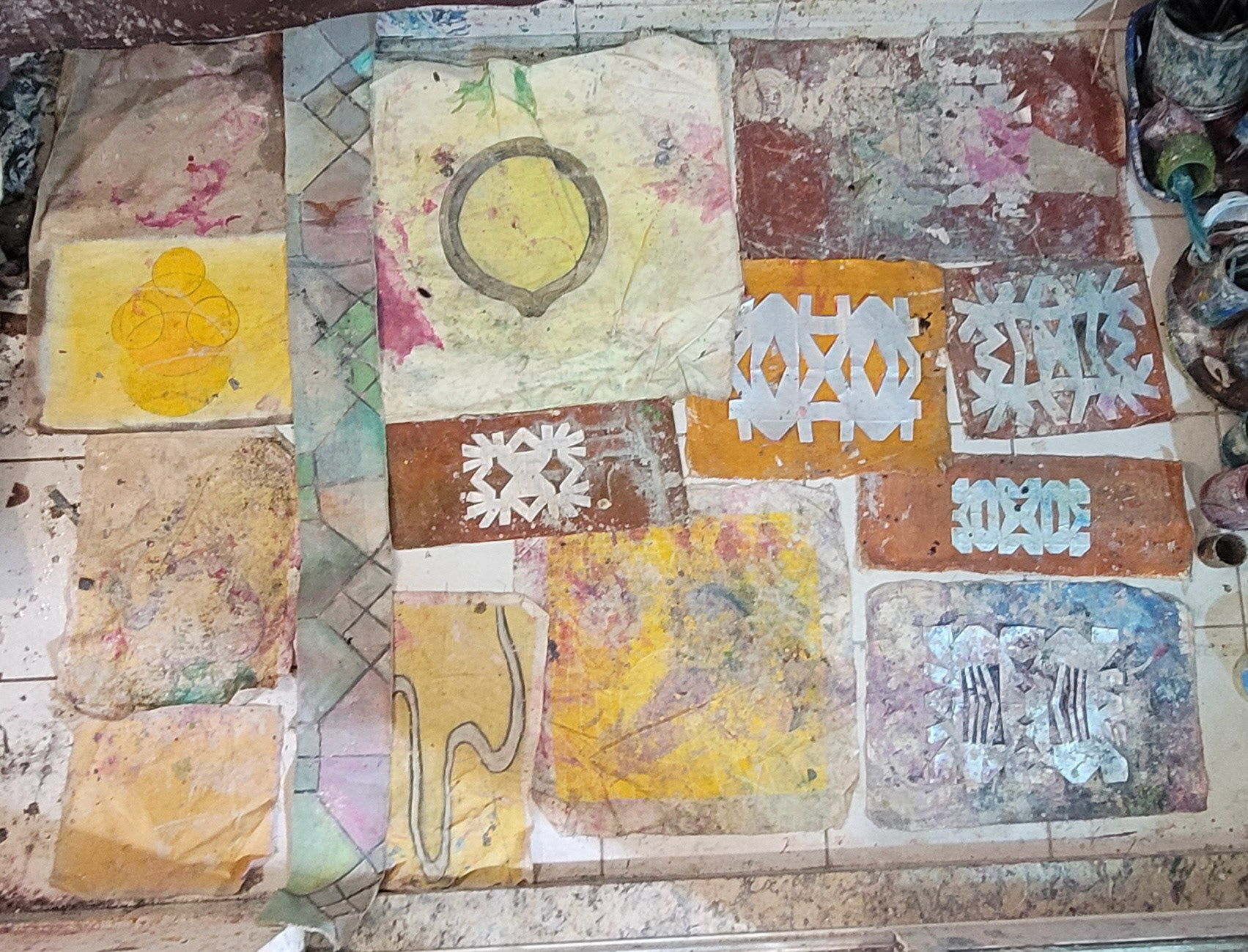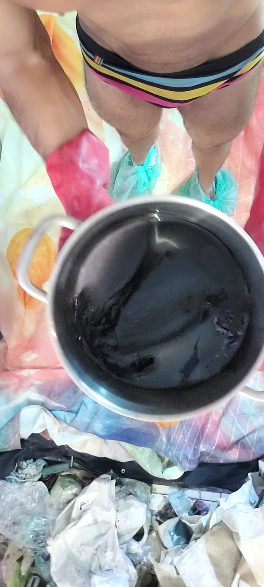 Essa etapa do tingimento não só documenta o processo, mas afirma o gesto como pintura em movimento, quase uma performance-palimpsesto: o chão vira constelação e o tecido, membrana de passagem.