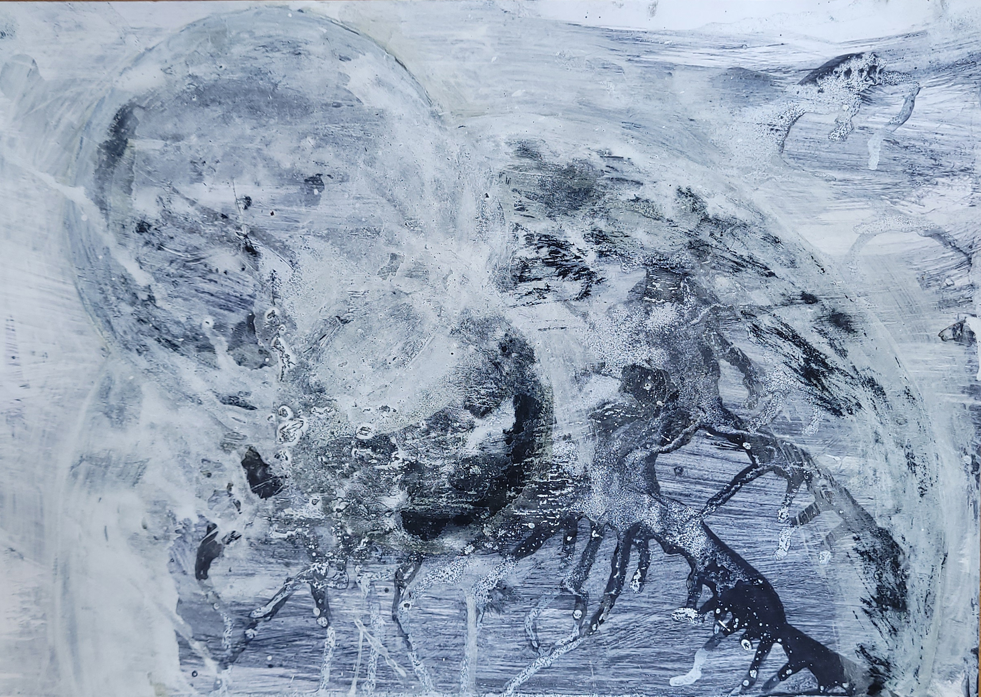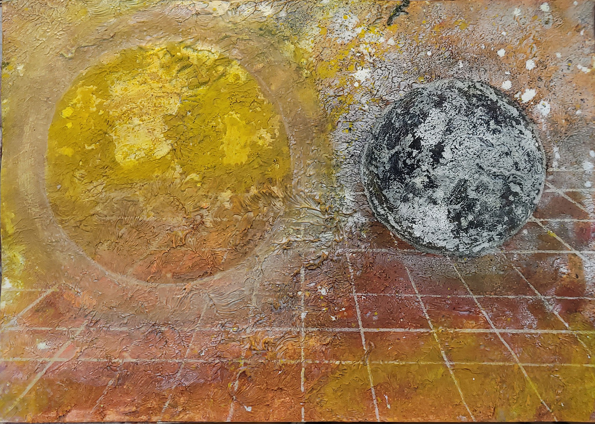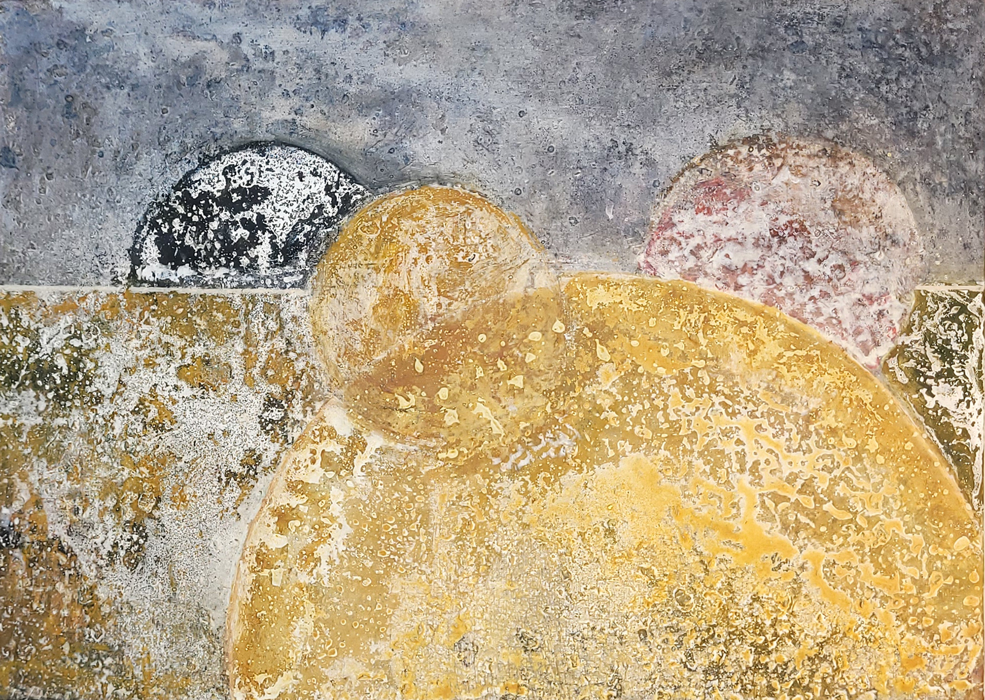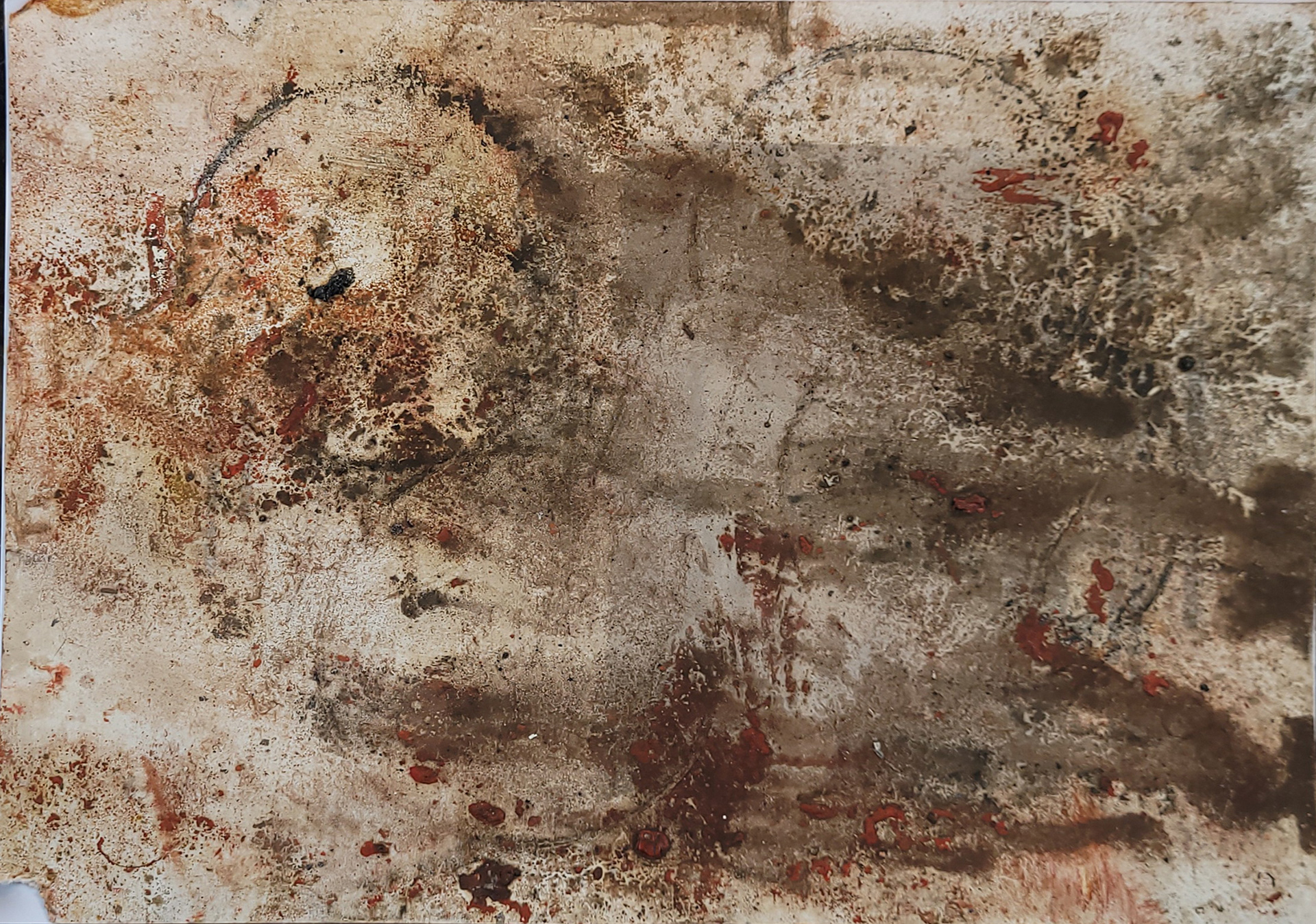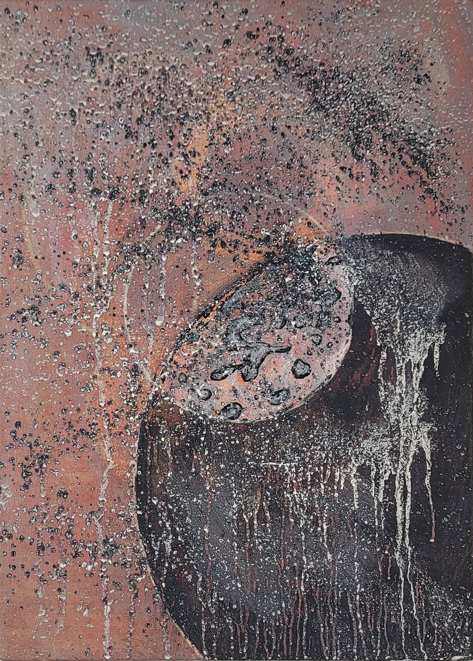 Algumas obras, notavelmente as de coloração terrosa e negra, têm uma força mineral e ritualística — parecem fragmentos arrancados de uma caverna com a unha. Outras, por outro lado ficam entre o gesto intuitivo e a composição ornamental. A porosidade respiratória, às vezes desintegração.
