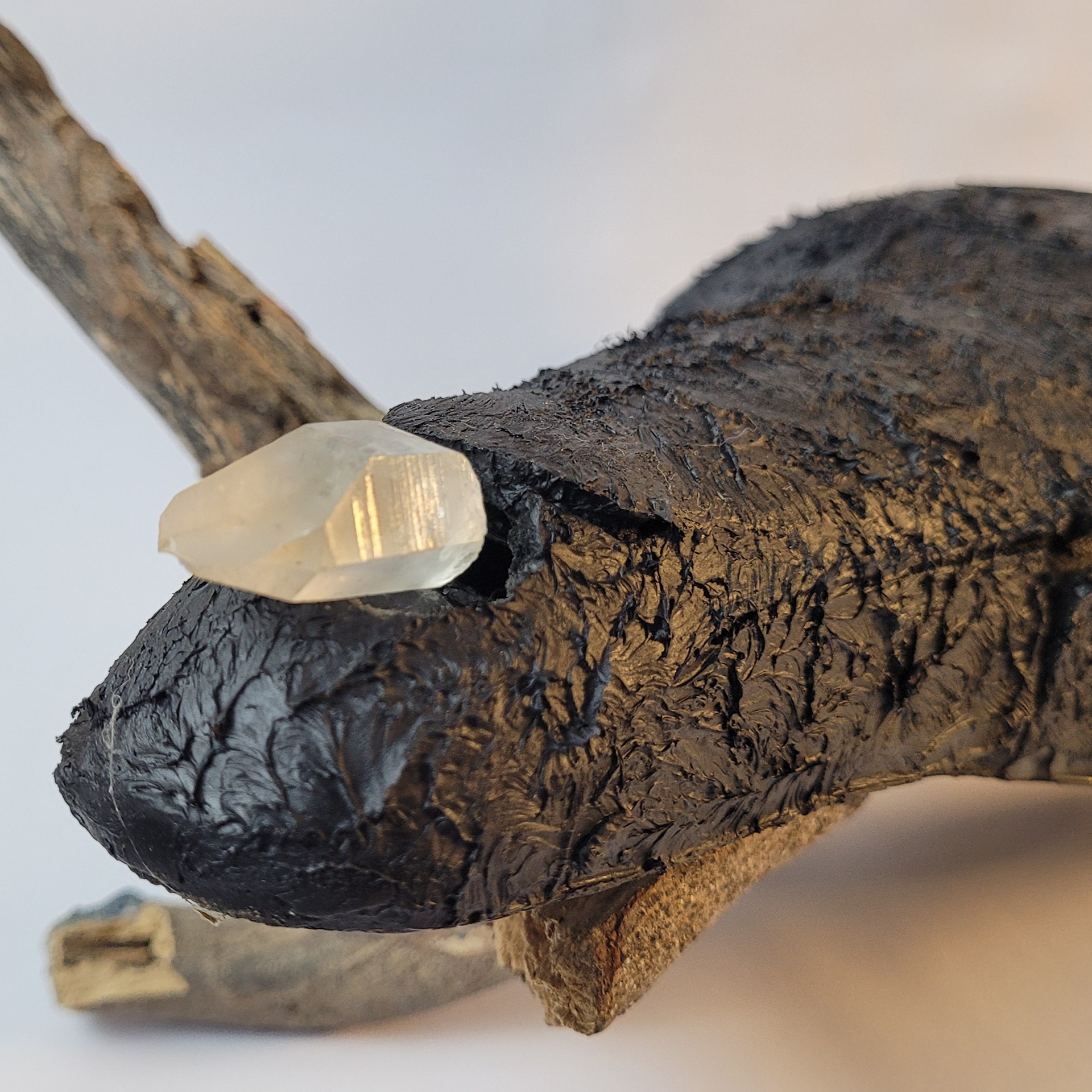 Within this zone of contact, a crystal found its place. Inserted at the tip of the saddle, it becomes a mineral prosthesis, pushing desire beyond the organic. An orifice receives the stone as though it had always belonged there.
